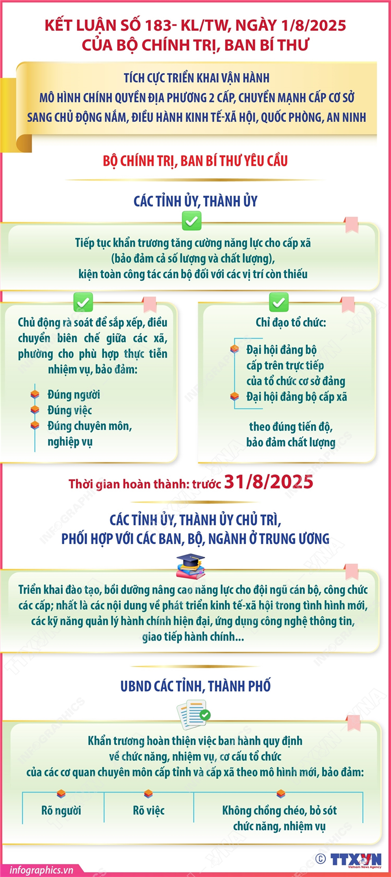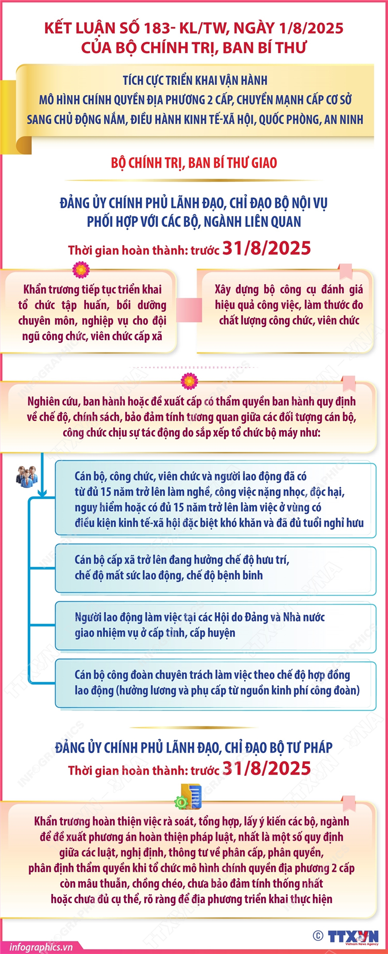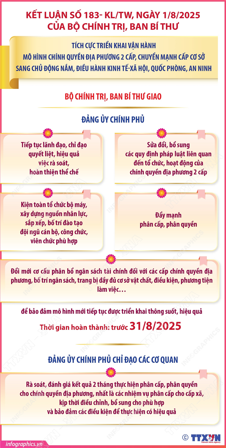 Phổ biến giáo dục Pháp luậtThông tin đồ họa Chính quyền địa phương 2 cấp: Bộ Chính trị, Ban Bí thư sẽ họp 1 tháng/lần để thảo luận, đánh giá tình hình, kết quả triển khai thực hiện các văn bản chỉ đạo, kết luận của Bộ Chính trị, Ban Bí thư04/08/2025 15:56Hà Nội (TTXVN 4/8) Thay mặt Bộ Chính trị, Thường trực Ban Bí thư Trần Cẩm Tú ký ban hành Kết Luận số 183- KL/TW, ngày 1/8/2025 của Bộ Chính trị, Ban Bí thư về tích cực triển khai vận hành mô hình chính quyền địa phương 2 cấp, chuyển mạnh cấp cơ sở sang chủ động nắm, điều hành kinh tế-xã hội, quốc phòng, an ninh. Bộ Chính trị, Ban Bí thư sẽ họp 1 tháng/lần để thảo luận, đánh giá tình hình, kết quả triển khai thực hiện các văn bản chỉ đạo, kết luận của Bộ Chính trị, Ban Bí thư. Giao Ban Tổ chức Trung ương chủ trì, phối hợp với Đảng ủy Chính... Kết luận số 183- KL/TW: Nhiệm vụ của Đảng ủy MTTQ, các đoàn thể Trung ương04/08/2025 15:55Kết luận số 183- KL/TW: Nhiệm vụ của UBKT Trung ương04/08/2025 15:55 Kết luận số 183- KL/TW: Nhiệm vụ của đảng ủy, tỉnh ủy, thành ủy trực thuộc Trung ương, các cơ quan, ban đảng ở Trung ương và các cơ quan có liên quan04/08/2025 15:54Hà Nội (TTXVN 4/8) Thay mặt Bộ Chính trị, Thường trực Ban Bí thư Trần Cẩm Tú ký ban hành Kết Luận số 183- KL/TW, ngày 1/8/2025 của Bộ Chính trị, Ban Bí thư về tích cực triển khai vận hành mô hình chính quyền địa phương 2 cấp, chuyển mạnh cấp cơ sở sang chủ động nắm, điều hành kinh tế-xã hội, quốc phòng, an ninh. Bộ Chính trị, Ban Bí thư giao các đảng ủy, tỉnh...Kết luận số 183- KL/TW: Nhiệm vụ của các tỉnh ủy, thành ủy04/08/2025 15:53Hà Nội (TTXVN 4/8) Thay mặt Bộ Chính trị, Thường trực Ban Bí thư Trần Cẩm Tú ký ban hành Kết Luận số 183- KL/TW, ngày 1/8/2025 của Bộ Chính trị, Ban Bí thư về tích cực triển khai vận hành mô hình chính quyền địa phương 2 cấp, chuyển mạnh cấp cơ sở sang chủ động nắm, điều hành kinh tế-xã hội, quốc phòng, an ninh. Bộ Chính trị, Ban Bí thư yêu cầu các tỉnh...Kết luận số 183- KL/TW: Các nhiệm vụ của Đảng ủy Chính phủ (phần 2 và hết)04/08/2025 15:52Hà Nội (TTXVN 4/8) Thay mặt Bộ Chính trị, Thường trực Ban Bí thư Trần Cẩm Tú ký ban hành Kết Luận số 183- KL/TW, ngày 1/8/2025 của Bộ Chính trị, Ban Bí thư về tích cực triển khai vận hành mô hình chính quyền địa phương 2 cấp, chuyển mạnh cấp cơ sở sang chủ động nắm, điều hành kinh tế-xã hội, quốc phòng, an ninh. Bộ Chính trị, Ban Bí thư giao Đảng ủy Chính phủ...Kết luận số 183- KL/TW: Nhiệm vụ của các bộ, ban, ngành và địa phương04/08/2025 15:52Hà Nội (TTXVN 4/8) Thay mặt Bộ Chính trị, Thường trực Ban Bí thư Trần Cẩm Tú ký ban hành Kết Luận số 183- KL/TW, ngày 1/8/2025 của Bộ Chính trị, Ban Bí thư về tích cực triển khai vận hành mô hình chính quyền địa phương 2 cấp, chuyển mạnh cấp cơ sở sang chủ động nắm, điều hành kinh tế-xã hội, quốc phòng, an ninh. Bộ Chính trị, Ban Bí thư giao các bộ, ban,...Kết luận số 183- KL/TW: Các nhiệm vụ của Đảng ủy Chính phủ (phần 1)04/08/2025 15:51Hà Nội (TTXVN 4/8) Thay mặt Bộ Chính trị, Thường trực Ban Bí thư Trần Cẩm Tú ký ban hành Kết Luận số 183- KL/TW, ngày 1/8/2025 của Bộ Chính trị, Ban Bí thư về tích cực triển khai vận hành mô hình chính quyền địa phương 2 cấp, chuyển mạnh cấp cơ sở sang chủ động nắm, điều hành kinh tế-xã hội, quốc phòng, an ninh. Bộ Chính trị, Ban Bí thư giao Đảng ủy Chính phủ...Kết luận số 183- KL/TW: Yêu cầu đối với các cấp ủy, tổ chức đảng từ Trung ương đến địa phương04/08/2025 15:50Hà Nội (TTXVN 2/8) Thay mặt Bộ Chính trị, Thường trực Ban Bí thư Trần Cẩm Tú ký ban hành Kết Luận số 183- KL/TW, ngày 1/8/2025 của Bộ Chính trị, Ban Bí thư về tích cực triển khai vận hành mô hình chính quyền địa phương 2 cấp, chuyển mạnh cấp cơ sở sang chủ động nắm, điều hành kinh tế-xã hội, quốc phòng, an ninh. Bộ Chính trị, Ban Bí thư yêu cầu các cấp...23/34 địa phương hoàn thành xóa nhà tạm, nhà dột nát (tính đến 30/7/2025)01/08/2025 15:46Hà Nội (TTXVN 1/8) Theo số liệu thống kê mới nhất từ Bộ Dân tộc và Tôn giáo, hiện có 23/34 địa phương đã công bố hoàn thành xóa nhà tạm, nhà dột nát; với ước tính khoảng 283 nghìn căn nhà hỗ trợ hộ nghèo, cận nghèo thuộc huyện nghèo của Chương trình mục tiêu quốc gia về giảm nghèo bền vững và người có công với... 1 2 3 4 5 ... 111