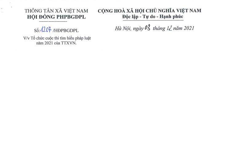 Phổ biến giáo dục Pháp luậtThi tìm hiểu pháp luật V/v Tổ chức cuộc thi tìm hiểu pháp luật năm 2021 của TTXVN Thứ hai, 06/12/2021 13:54 "Xin mời bấm vào đây để xem nội dung" Phòng Tổng hợp - Pháp chếThường trực Hội đồng phối hợp phổ biến, giáo dục pháp luật TTXVN