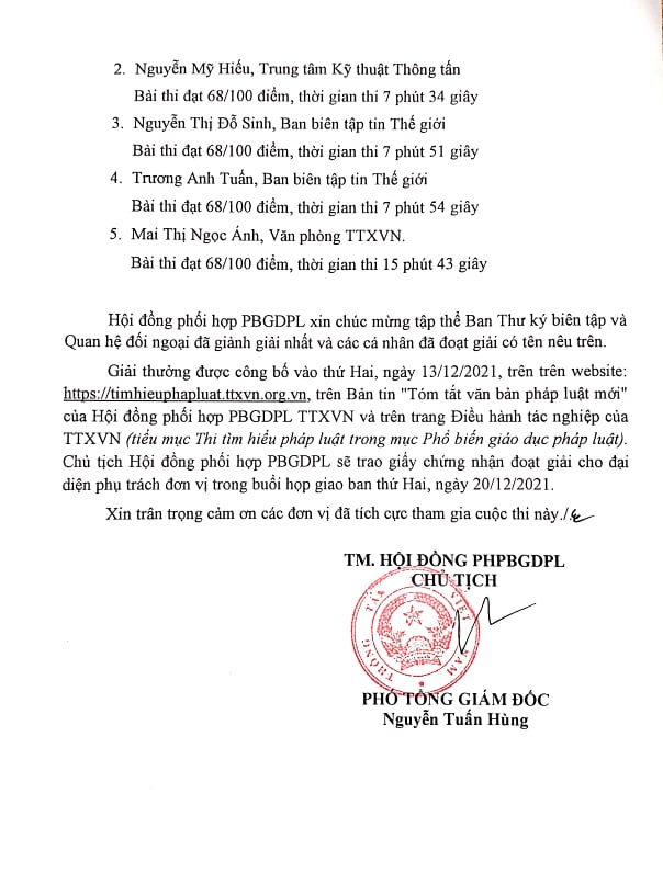 Phổ biến giáo dục Pháp luậtThi tìm hiểu pháp luật Công bố danh sách tập thể, cá nhân đoạt giải Cuộc thi "Tìm hiểu pháp luật năm 2021" của TTXVN Thứ hai, 13/12/2021 15:25 Phòng Tổng hợp - Pháp chếThường trực Hội đồng phối hợp phổ biến, giáo dục pháp luật TTXVN