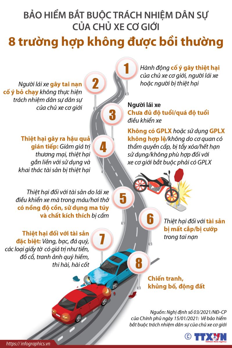Phổ biến giáo dục Pháp luậtThông tin đồ họa Bảo hiểm bắt buộc TNDS của chủ xe cơ giới Thứ năm, 18/03/2021 08:57 Điều 13 Nghị định 03/2021/NĐ-CP về bảo hiểm bắt buộc trách nhiệm dân sự của chủ xe cơ giới có hiệu lực từ 1/3/2021, theo đó có 8 trường hợp chủ xe không được bảo hiểm bồi thường thiệt hại. vnanet.vn