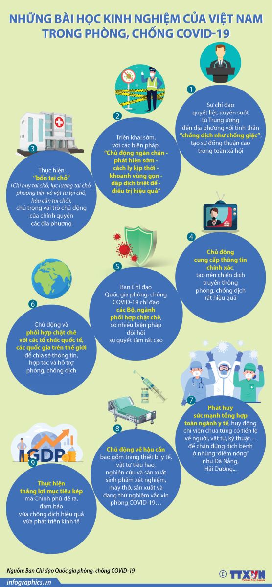 Phổ biến giáo dục Pháp luậtThông tin đồ họa Những bài học kinh nghiệm của Việt Nam trong phòng, chống COVID-19 Thứ năm, 18/03/2021 09:12 Với tinh thần bảo vệ sức khỏe người dân được đặt lên hàng đầu, Việt Nam đã sáng tạo ra những cách phòng, chống dịch COVID-19 rất hiệu quả. Nỗ lực phòng chống COVID-19 của Việt Nam đã được cộng đồng quốc tế ca ngợi và xem là hình mẫu để học hỏi.