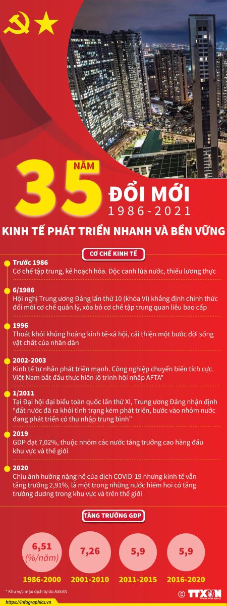 Phổ biến giáo dục Pháp luậtThông tin đồ họa 35 năm đổi mới (1986-2021): Kinh tế phát triển nhanh và bền vững Thứ năm, 18/03/2021 09:14 Sau 35 năm thực hiện công cuộc đổi mới (1986-2021), Việt Nam đã thoát khỏi tình trạng kém phát triển, trở thành nước đang phát triển có thu nhập trung bình với một nền kinh tế thị trường năng động, hội nhập mạnh mẽ.