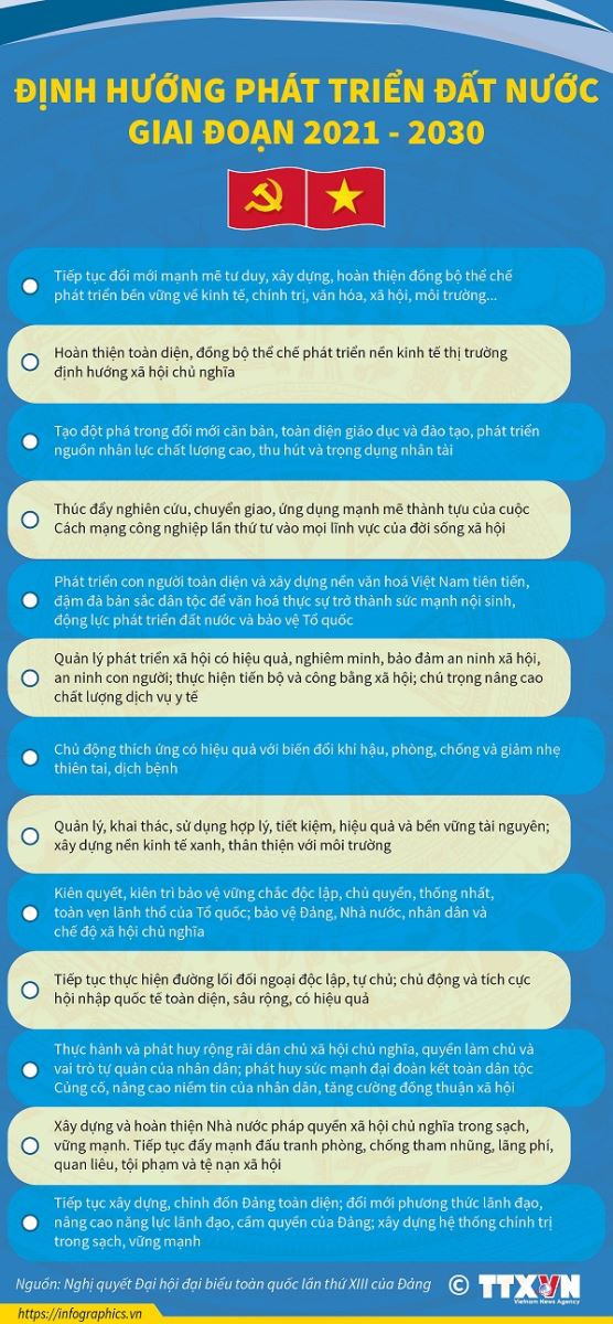 Phổ biến giáo dục Pháp luậtThông tin đồ họa Định hướng phát triển đất nước giai đoạn 2021-2030 Thứ năm, 18/03/2021 09:21 Đại hội đại biểu toàn quốc lần thứ XIII Đảng Cộng sản Việt Nam đã đề ra các định hướng lớn bao quát những vấn đề phát triển quan trọng của đất nước trong giai đoạn 2021-2030.