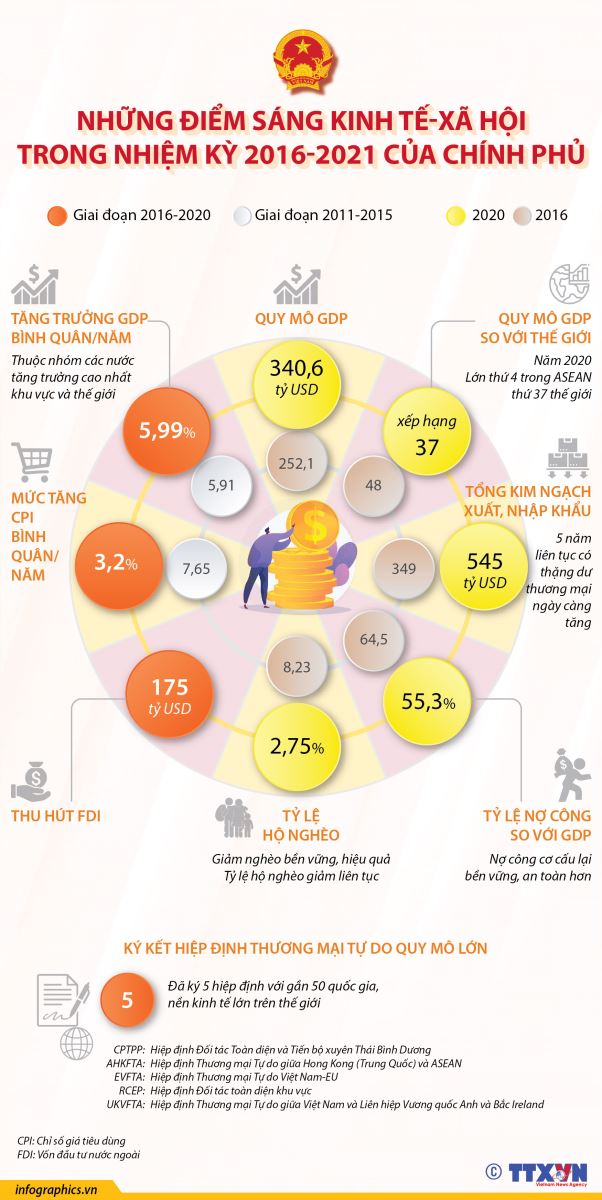 Phổ biến giáo dục Pháp luậtThông tin đồ họa Những điểm sáng kinh tế-xã hội trong nhiệm kỳ 2016-2021 của Chính phủ Thứ hai, 29/03/2021 10:14 Trong nhiệm kỳ 2016-2021, Chính phủ đã điều hành ổn định kinh tế vĩ mô, kiểm soát lạm phát, tạo môi trường thuận lợi thúc đẩy tăng trưởng kinh tế, giảm nghèo hiệu quả