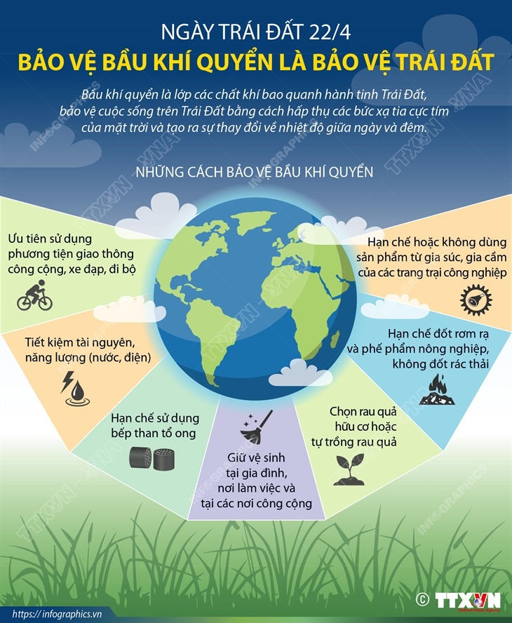 Phổ biến giáo dục Pháp luậtThông tin đồ họa Ngày Trái đất 22/4: Bảo vệ bầu khí quyển là bảo vệ Trái Đất Thứ năm, 22/04/2021 10:16 Bầu khí quyển là lớp các chất khí bao quanh hành tinh Trái Đất, bảo vệ cuộc sống trên Trái Đất bằng cách hấp thụ các bức xạ tia cực tím của mặt trời và tạo ra sự thay đổi về nhiệt độ giữa ngày và đêm.