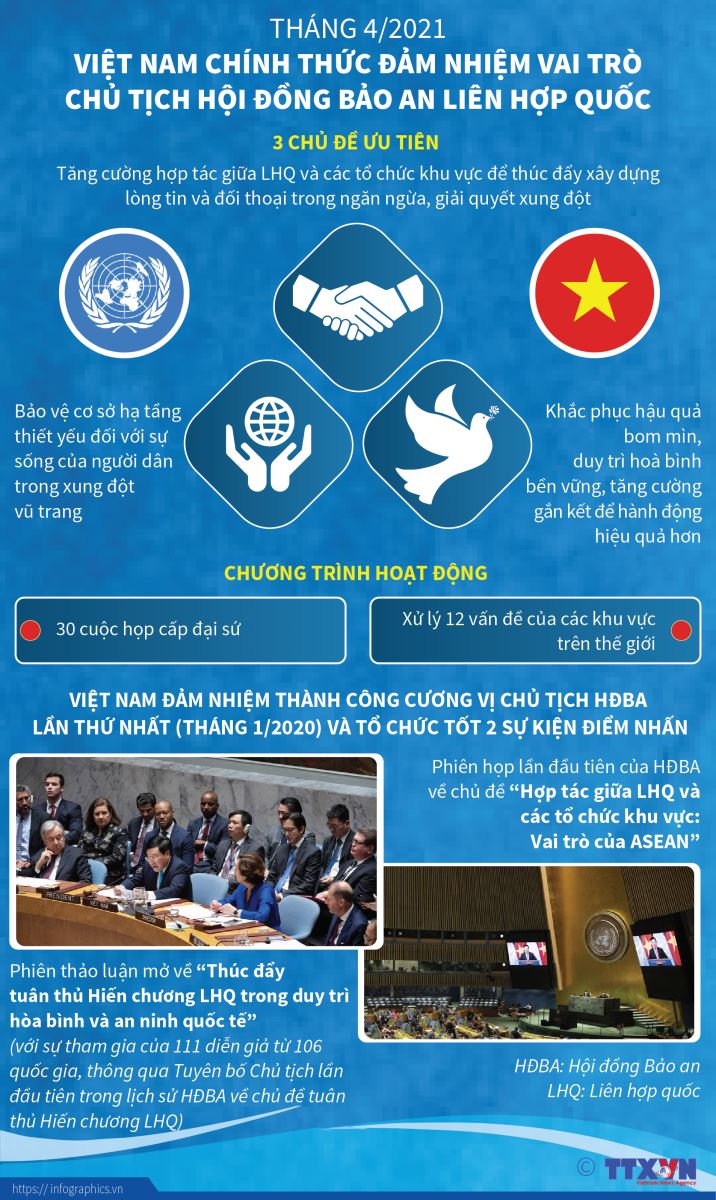 Tin cùng chuyên mục Ngày Trái đất 22/4: Bảo vệ bầu khí quyển là bảo vệ Trái Đất22/04/2021 10:16Bầu khí quyển là lớp các chất khí bao quanh hành tinh Trái Đất, bảo vệ cuộc sống trên Trái Đất bằng cách hấp thụ các bức xạ tia cực tím của mặt trời và tạo ra sự thay đổi về nhiệt độ giữa ngày và đêm. Chủ tịch nước Nguyễn Xuân Phúc chủ trì Hội nghị cấp cao HĐBA Liên hợp quốc20/04/2021 14:22Trên cương vị Chủ tịch Hội đồng Bảo an Liên hợp quốc, ngày 19/4, Việt Nam sẽ tổ chức Phiên thảo luận cấp cao trực tuyến với chủ đề "Vai trò của các tổ chức khu vực trong thúc đẩy xây dựng lòng tin và đối thoại trong ngăn ngừa xung đột". Phiên thảo luận do Chủ tịch nước Nguyễn Xuân Phúc chủ trì, đánh dấu lần đầu tiên lãnh đạo cấp cao của Việt Nam... Đối tượng và điều kiện dự thi tốt nghiệp THPT 202113/04/2021 08:30Kỳ thi tốt nghiệp Trung học phổ thông năm 2021 dự kiến sẽ diễn ra từ ngày 6-8/7. Thời gian đăng ký dự thi dự kiến từ ngày 26/4 đến hết ngày 10/5/2021. Hà Nội điều chỉnh thời gian tuyển sinh đầu cấp từ mầm non đến THCS12/04/2021 14:54Do ảnh hưởng của dịch COVID-19, Sở Giáo dục và Đào tạo Hà Nội đã điều chỉnh thời gian tuyển sinh vào các trường mầm non, lớp 1, lớp 6 năm học 2021-2022. Các chỉ tiêu chủ yếu về phát triển kinh tế 5 năm (2021-2025) và 10 năm (2021-2030)06/04/2021 11:19 Chiến lược phát triển kinh tế-xã hội 10 năm 2021-2030 và Phương hướng nhiệm vụ phát triển kinh tế-xã hội 5 năm 2021-2025 đề ra mục tiêu đến năm 2025, Việt Nam là nước đang phát triển có công nghiệp hiện đại, vượt qua mức thu nhập trung bình thấp; đến năm 2030 là nước đang phát triển có công nghiệp hiện đại, thu nhập trung bình cao và đến năm 2045... Việt Nam chính thức đảm nhiệm vai trò Chủ tịch Hội đồng Bảo an Liên hợp quốc01/04/2021 11:19Trong tháng 4/2021, Việt Nam đảm nhiệm vai trò Chủ tịch luân phiên Hội đồng Bảo an Liên hợp quốc (HĐBA LHQ). Đây là kỳ Chủ tịch thứ hai, đồng thời cũng là kỳ Chủ tịch cuối cùng của Việt Nam trong nhiệm kỳ Ủy viên không thường trực HĐBA LHQ 2020-2021.