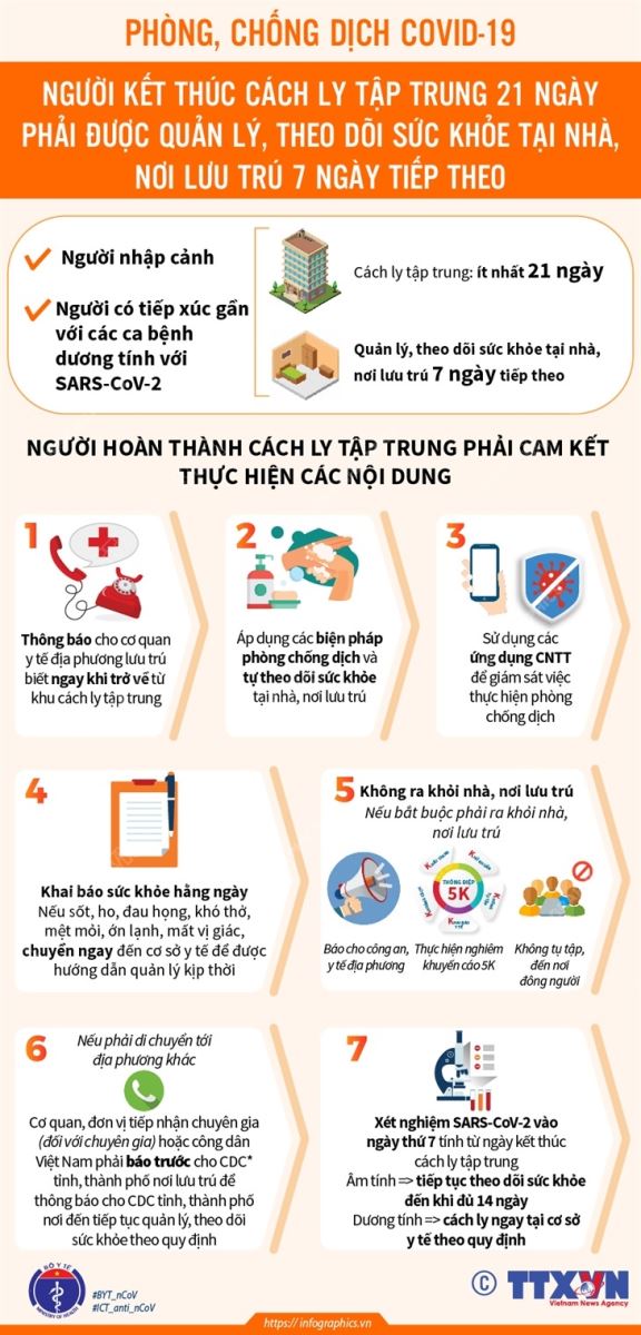 Phổ biến giáo dục Pháp luậtThông tin đồ họa Người kết thúc cách ly tập trung 21 ngày phải được quản lý, theo dõi sức khỏe tại nhà, nơi lưu trú 7 ngày tiếp theo Thứ năm, 06/05/2021 15:26 Ban Chỉ đạo Quốc gia phòng, chống dịch COVID-19 vừa ra công điện hỏa tốc về thực hiện nghiêm các quy định cách ly tập trung và quản lý sau khi kết thúc cách ly tập trung 21 ngày phòng, chống dịch COVID-19. Theo đó, người kết thúc cách ly tập trung phải được quản lý, theo dõi sức khỏe tại nhà, nơi lưu trú 7 ngày tiếp theo.
