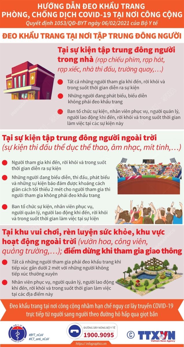 Tin cùng chuyên mục Người kết thúc cách ly tập trung 21 ngày phải được quản lý, theo dõi sức khỏe tại nhà, nơi lưu trú 7 ngày tiếp theo06/05/2021 15:26Ban Chỉ đạo Quốc gia phòng, chống dịch COVID-19 vừa ra công điện hỏa tốc về thực hiện nghiêm các quy định cách ly tập trung và quản lý sau khi kết thúc cách ly tập trung 21 ngày phòng, chống dịch COVID-19. Theo đó, người kết thúc cách ly tập trung phải được quản lý, theo dõi sức khỏe tại nhà, nơi lưu trú 7 ngày tiếp theo. Điều chỉnh thời gian cách ly tập trung lên 21 ngày06/05/2021 15:24Để đảm bảo an toàn cho cộng đồng tránh được sự lây nhiễm SARS-CoV-2 từ những người có tiếp xúc gần với các ca bệnh COVID-19, sau khi tham khảo ý kiến của các chuyên gia về dịch tễ học và virus học, Bộ Y tế quyết định sẽ kéo dài thời gian cách ly tập trung lên 21 ngày. Hà Nội vận động người dân không ra khỏi nhà khi không cần thiết06/05/2021 15:23Chủ tịch UBND thành phố Hà Nội vừa ban hành Chỉ thị số 11/CT-UBND yêu cầu tăng cường thực hiện quyết liệt các biện pháp phòng, chống dịch COVID-19 trong tình hình mới. Hà Nội dừng hoạt động quán ăn, uống đường phố, trà đá, cà phê vỉa hè để chống dịch COVID-1905/05/2021 10:22Từ 17h ngày 3/5, Hà Nội dừng hoạt động quán ăn, uống đường phố, trà đá, cà phê vỉa hè để chống dịch COVID-19. Đeo khẩu trang tại nơi có không gian kín27/04/2021 14:01Để phòng, chống dịch COVID-19, mọi người cần nghiêm túc thực hiện đeo khẩu trang tại các nơi có không gian kín như: phòng tập thể dục-thể hình, quán bar, karaoke, nhà máy, xí nghiệp... nhằm hạn chế nguy cơ lây truyền COVID-19 trực tiếp từ người sang người theo đường hô hấp qua giọt bắn (theo Quyết định số 1053/QĐ-BYT ngày 06/02/2021 của Bộ... Đeo khẩu trang tại sự kiện tập trung đông người trong nhà và ngoài trời26/04/2021 09:13Để phòng, chống dịch COVID-19, mọi người cần nghiêm túc thực hiện đeo khẩu trang tại các sự kiện tập trung đông người trong nhà và ngoài trời... nhằm hạn chế nguy cơ lây truyền COVID-19 trực tiếp từ người sang người theo đường hô hấp qua giọt bắn (theo Quyết định số 1053/QĐ-BYT ngày 06/02/2021 của Bộ Y tế)