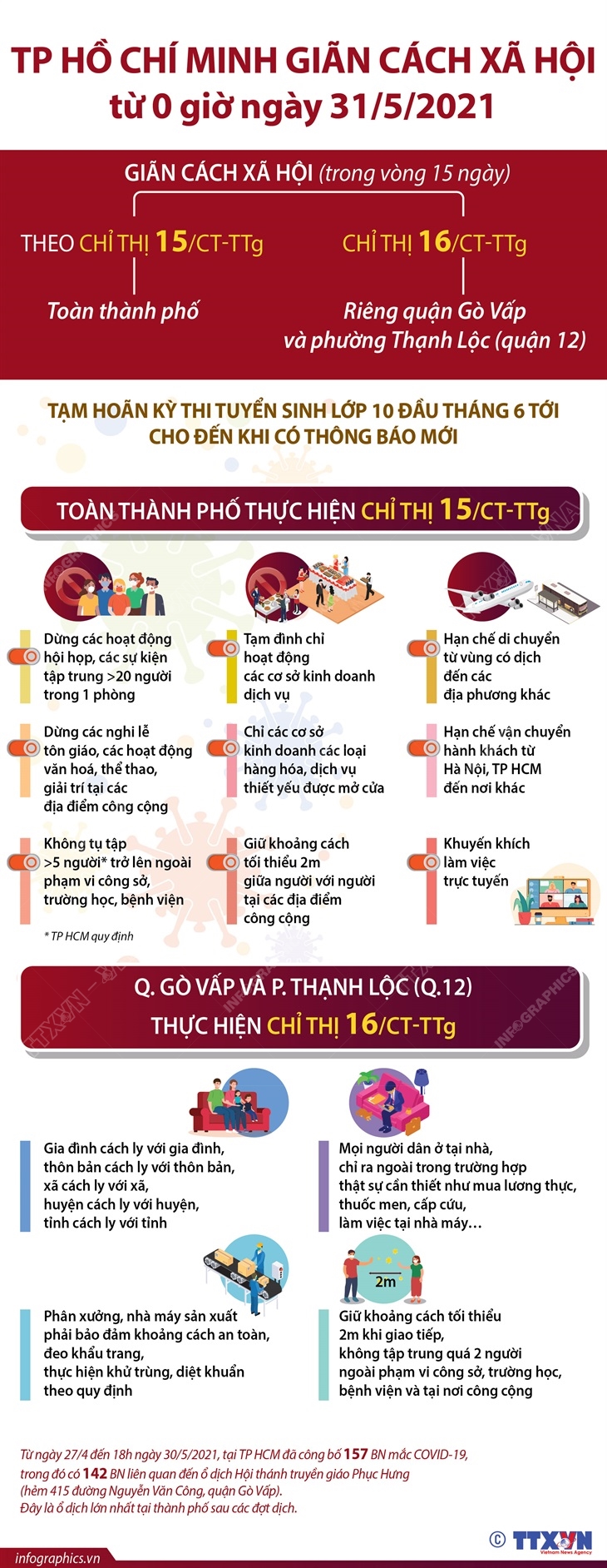 Tin cùng chuyên mục Ưu tiên cho lực lượng tuyến đầu phòng chống dịch và thúc đẩy, phát triển kinh tế12/07/2021 16:09Toàn bộ người dân trong độ tuổi có chỉ định sử dụng vắc xin theo khuyến cáo của nhà sản xuất là đối tượng tiêm vắc xin, trong đó ưu tiên cho lực lượng tuyến đầu phòng chống dịch và lực lượng tuyến đầu trong thúc đẩy, phát triển kinh tế (theo Quyết định 3355/QĐ-BYT ngày 08/7/2021 của Bộ Y tế). Hà Nội mở lại dịch vụ cắt tóc, ăn uống trong nhà (từ 0 giờ ngày 22/6/2021)22/06/2021 10:14Từ 0 giờ ngày 22/6/2021, Hà Nội cho phép mở cửa trở lại dịch vụ cắt tóc, gội đầu, dịch vụ ăn, uống trong nhà, với điều kiện đảm bảo: Khoảng cách, có tấm chắn giữa người với người, ngồi không quá 50% công suất chỗ ngồi và không quá 20 người, đóng cửa trước 21 giờ hàng ngày (theo công văn số 1942/UBND-KGVX ngày 21/6/2021 của UBND TP.Hà Nội). Những điều cần nhớ khi tiêm chủng vắc xin phòng COVID-1921/06/2021 17:08Khi tiêm chủng vắc xin phòng COVID-19, bạn cần nhớ những điều sau Quy tắc ứng xử chung trên mạng xã hội21/06/2021 17:02Bộ Thông tin và Truyền thông vừa ban hành Bộ Quy tắc ứng xử trên mạng xã hội. Bộ Quy tắc hướng đến xây dựng chuẩn mực đạo đức về hành vi ứng xử trên mạng xã hội, giáo dục ý thức, tạo thói quen tích cực trong các hành vi ứng xử của người dùng trên mạng xã hội, góp phần xây dựng mạng an toàn, lành mạnh tại Việt Nam. Thủ tướng Phạm Minh Chính chỉ đạo: Kiềm chế, đẩy lùi, tiến tới dập tắt dịch COVID-1931/05/2021 15:07Thủ tướng Phạm Minh Chính chủ trì hội nghị trực tuyến toàn quốc về tình hình, giải pháp cấp bách phòng, chống dịch COVID-19. Tại Hội nghị, Thủ tướng chỉ đạo các địa phương phải phòng chống dịch từ xa, từ sớm, từ trước khi có dịch với phương châm 5K + vắc xin + công nghệ (29/5/2021). Thành phố Hồ Chí Minh giãn cách xã hội từ 0h ngày 31/5/202131/05/2021 15:05Từ 0h ngày 31/5/2021, TP Hồ Chí Minh sẽ áp dụng Chỉ thị 15/CT-TTg trên địa bàn Thành phố, riêng quận Gò Vấp phong tỏa theo Chỉ thị 16/CT-TTg trong vòng 15 ngày.