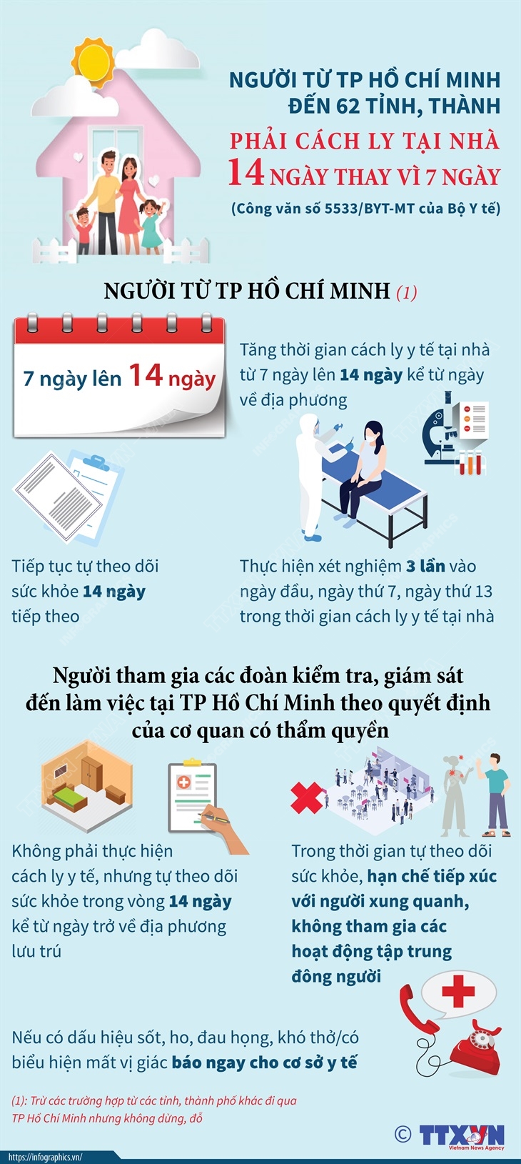 Phổ biến giáo dục Pháp luậtThông tin đồ họa Người từ TP Hồ Chí Minh đến 62 tỉnh, thành phải cách ly tại nhà 14 ngày thay vì 7 ngày Thứ tư, 14/07/2021 15:04 Nhằm đảm bảo an toàn, hạn chế tối đa nguy cơ lây nhiễm COVID-19 ra cộng đồng đối với những người từ TP Hồ Chí Minh về địa phương, Bộ Y tế ban hành công văn số 5533/BYT-MT về việc điều chỉnh thời gian cách ly y tế tại nhà và xét nghiệm đối với người từ TP Hồ Chí Minh đến 62 tỉnh, thành từ 7 ngày lên 14 ngày.