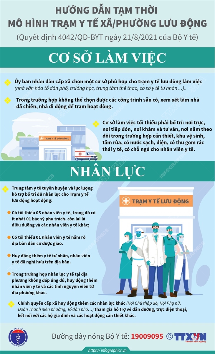 Tin cùng chuyên mục Thông điệp 5T - "Pháo đài" chống dịch COVID-19 trong tăng cường giãn cách xã hội07/09/2021 15:46 "Pháo đài" chống dịch COVID-19 trong tăng cường giãn cách xã hội07/09/2021 15:45hông điệp 5T chính là "pháo đài" chống dịch COVID-19 trong tăng cường giãn cách xã hội giữa bối cảnh dịch bệnh diễn biến phức tạp hiện nay. Trạm y tế lưu động truyền thông về COVID-19 và khám, điều trị, cấp thuốc cho người mắc các bệnh khác01/09/2021 09:16Trạm y tế lưu động có nhiệm vụ truyền thông về COVID-19 khám, điều trị, cấp thuốc cho người mắc các bệnh khác và thực hiện các nhiệm vụ khác do Giám đốc Trung tâm y tế quận/huyện phân công (theo Quyết định số 4042/QĐ-BYT ngày 21/8/2021 của Bộ Y tế). Trạm y tế lưu động xét nghiệm COVID-19 và tiêm chủng vắc xin phòng COVID-1901/09/2021 09:14Trạm y tế lưu động có nhiệm vụ xét nghiệm COVID-19 và tiêm chủng vắc xin phòng COVID-19 (theo Quyết định số 4042/QĐ-BYT ngày 21/8/2021 của Bộ Y tế). Trạm y tế lưu động quản lý, theo dõi người nhiễm COVID-19 tại nhà và tại cộng đồng01/09/2021 09:11Trạm y tế lưu động có nhiệm vụ quản lý, theo dõi người nhiễm COVID-19 tại nhà và tại cộng đồng như: Tổng hợp danh sách trường hợp nhiễm COVID-19 trên địa bàn, danh sách trường hợp nhiễm COVID-19 cách ly tại nhà; Hướng dẫn, tư vấn, thường xuyên theo dõi sức khỏe và hỗ trợ chăm sóc trường hợp nhiễm COVID-19 được cách ly tại nhà theo hướng dẫn của Bộ... Trạm y tế lưu động có tối thiểu 05 nhân viên y tế01/09/2021 08:49rạm y tế lưu động tối thiểu phải bố trí: nơi trực, nơi tiếp đón, nơi khám và tư vấn, nơi nằm theo dõi trong trường hợp cần thiết, khu vệ sinh, tắm rửa, có nước sạch, điện, có thu gom rác thải y tế, có chỗ ngủ cho nhân viên y tế. Trạm phải có tối thiểu 05 nhân viên y tế, trong đó có ít nhất 01 bác sỹ phụ trách, còn lại là điều dưỡng và các nhân viên...