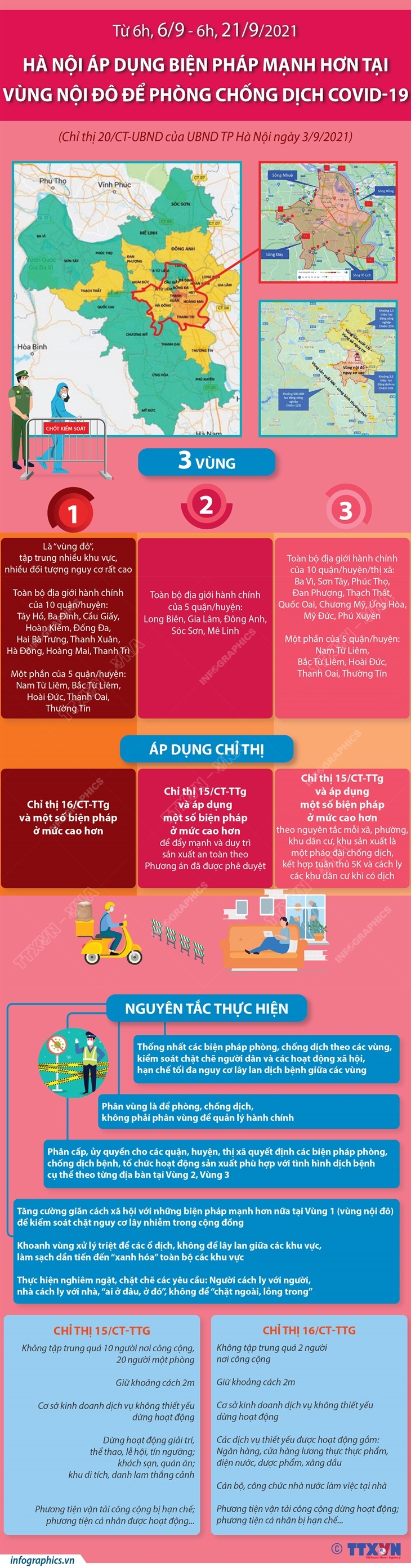 Phổ biến giáo dục Pháp luậtThông tin đồ họa Từ 6h ngày 21/9/2021: Hà Nội tiếp tục tạm dừng một số hoạt động để phòng, chống dịch Covid-19 Thứ ba, 21/09/2021 17:18 Từ 6h ngày 21/9/2021, Hà Nội điều chỉnh các biện pháp phòng, chống dịch bệnh COVID-19 trên địa bàn thành phố theo nguyên tắc tại Chỉ thị 15/CT-TTg và một số biện pháp cao hơn phù hợp với tình hình thực tế cho đến khi hoàn thành việc tiêm chủng mũi 2 cho toàn bộ người dân trong độ tuổi tiêm chủng và có thông báo mới của thành phố (theo Chỉ thị số 22/CT-UBND ngày 20/9/2021 của UBND thành phố Hà Nội).