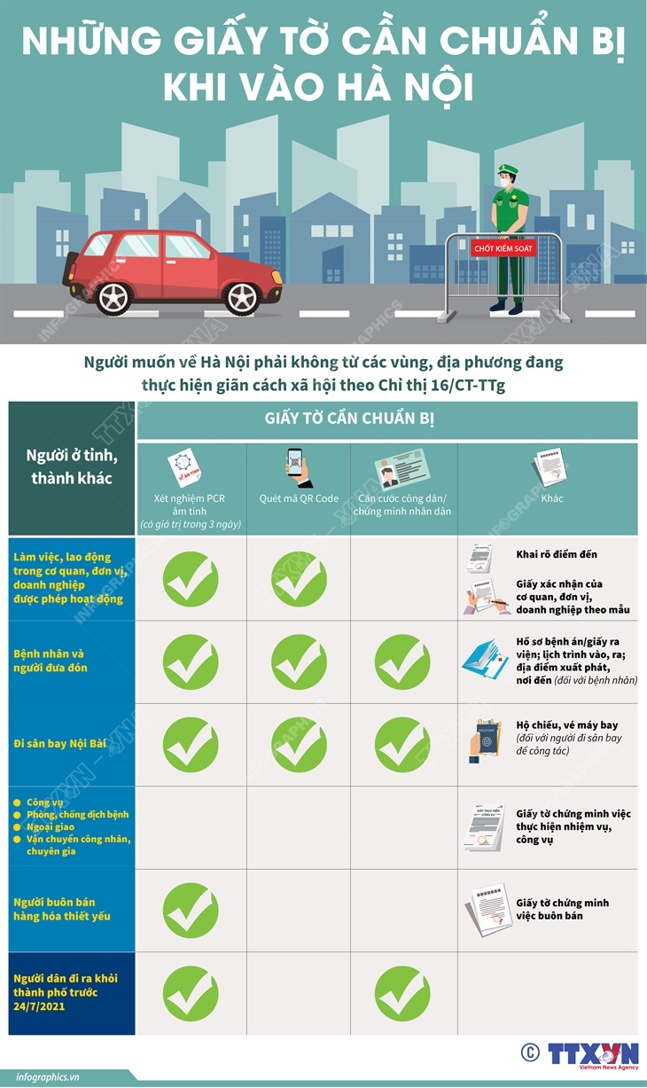 Phổ biến giáo dục Pháp luậtThông tin đồ họa Những giấy tờ cần chuẩn bị khi vào Hà Nội Thứ sáu, 24/09/2021 14:45 Hà Nội điều chỉnh biện pháp phòng, chống dịch COVID-19 theo hướng nới lỏng giãn cách nhưng vẫn kiểm soát chặt chẽ người ra, vào thành phố từ 6h ngày 21/9/2021. Cụ thể như sau: