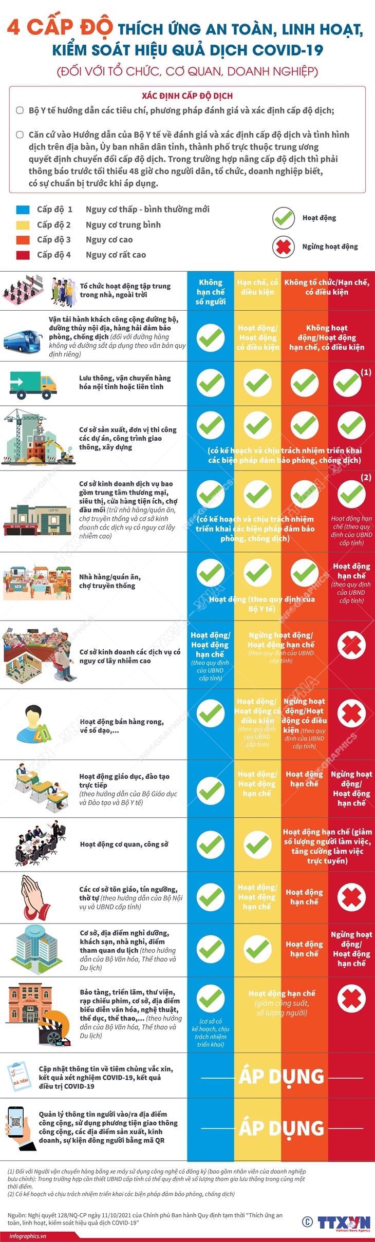 Tin cùng chuyên mục Khuyến cáo của nhà sản xuất về vắc xin COVID-19 Vero Cell của Sinopharm25/10/2021 16:15Người có tiền sử phản ứng nặng sau lần tiêm chủng vắc xin COVID-19 Vero Cell của Sinopharm trước đó sẽ không tiêm liều thứ hai. Hướng dẫn tổ chức dạy học trực tiếp tại các cơ sở giáo dục21/10/2021 16:06Theo công văn số 4726/BGDĐT-GDTC về việc tổ chức hoạt động dạy học trực tiếp tại các cơ sở giáo dục, Bộ Giáo dục và Đào tạo đề nghị UBND các tỉnh, thành phố chỉ đạo rà soát các điều kiện để tổ chức cho học sinh tới lớp học trực tiếp đảm bảo an toàn tại các cơ sở giáo dục. 3 tiêu chí đánh giá cấp độ dịch21/10/2021 16:03Có 3 tiêu chí đánh giá cấp độ dịch theo Hướng dẫn tạm thời về chuyên môn y tế thực hiện Nghị quyết số 128/NQ-CP của Chính phủ, đó là: Số ca mắc mới tại cộng đồng/100.000 người/tuần, Tỷ lệ người từ 18 tuổi trở lên được tiêm ít nhất 1 liều vắc xin phòng COVID-19 và Đảm bảo khả năng thu dung, điều trị của cơ sở khám bệnh, chữa bệnh các tuyến (theo... Thực hiện Nghị quyết 128/NQ-CP: 23 tỉnh, thành phố công bố cấp độ dịch COVID-1918/10/2021 10:48Theo Nghị quyết 128/NQ-CP, có 4 cấp độ dịch gồm: Cấp 1 (nguy cơ thấp - bình thường mới) tương ứng với màu xanh cấp 2 (nguy cơ trung bình) tương ứng với màu vàng cấp 3 (nguy cơ cao) tương ứng với màu cam cấp 4 (nguy cơ rất cao) tương ứng với màu đỏ. Đến 16/10/2021, đã có 13 tỉnh xác định cấp độ dịch là cấp 1 10 tỉnh, thành phố xác định cấp độ 2 các... Người từ TP HCM bay ra Hà Nội phải tuân thủ quy định gì?14/10/2021 15:05Hà Nội bỏ quy định người bay từ TP HCM ra phải cách ly tập trung, chỉ phải tự theo dõi sức khỏe tại nhà hoặc nơi lưu trú và thực hiện các biện pháp đảm bảo phòng chống dịch COVID-19 theo quy định của trung ương và thành phố. Bốn cấp độ "thích ứng an toàn" với dịch COVID-19 (đối với tổ chức, cơ quan, doanh nghiệp)13/10/2021 09:52Nghị quyết số 128/NQ-CP ngày 11/10/2021 của Chính phủ về quy định tạm thời "Thích ứng an toàn, linh hoạt, kiểm soát hiệu quả dịch COVID-19" đã nêu mục tiêu hạn chế thấp nhất ca nhiễm, ca chuyển nặng, tử vong do COVID-19; khôi phục và phát triển kinh tế - xã hội; thực hiện mục tiêu kép, đưa cả nước chuyển sang trạng thái bình thường mới sớm nhất có...