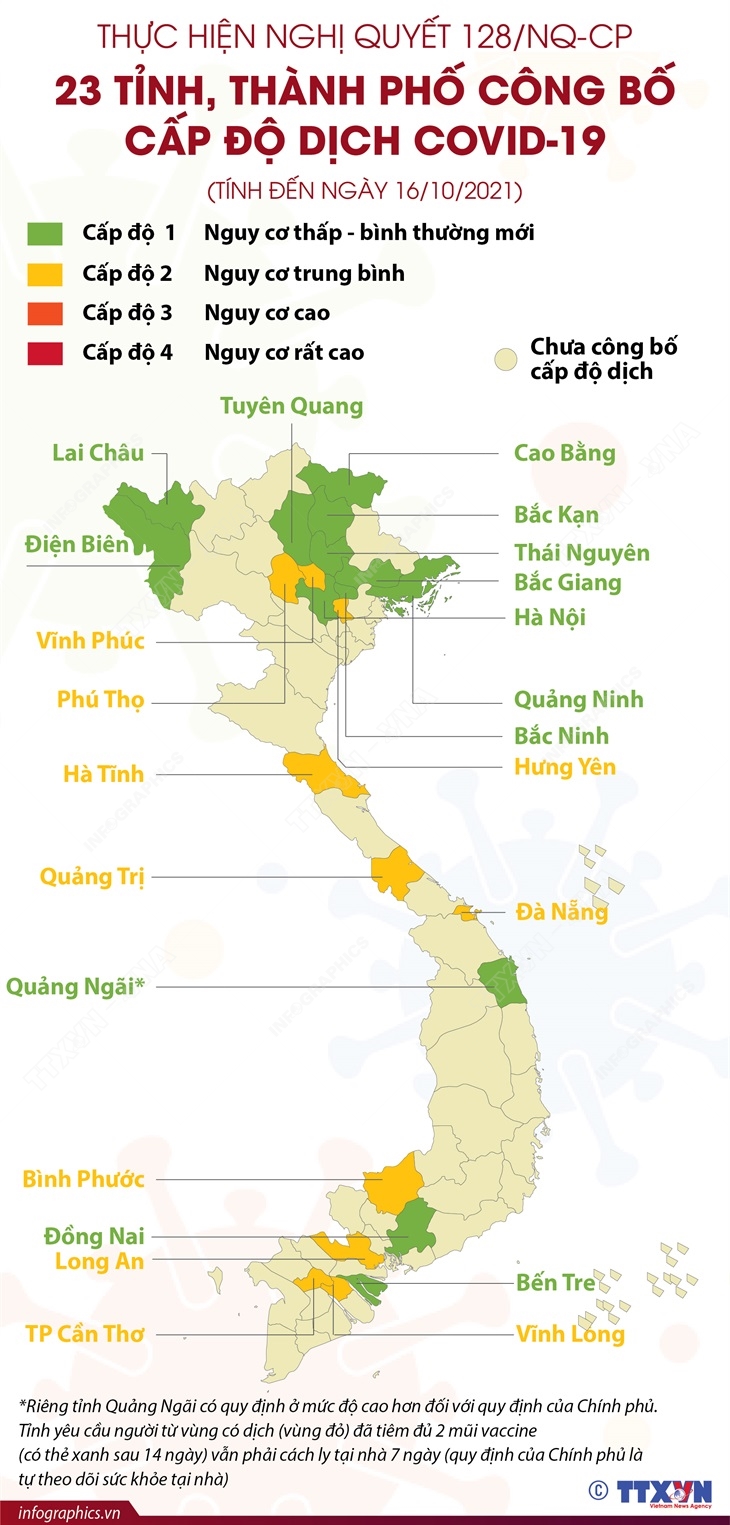 Tin cùng chuyên mục Tiêm chủng vắc xin COVID-19 Vero Cell của Sinopharm cho một số nhóm đối tượng đặc biệt25/10/2021 16:16Dưới đây là những lưu ý khi tiêm chủng vắc xin COVID-19 Vero Cell của Sinopharm cho một số nhóm đối tượng đặc biệt như người từ 60 tuổi trở lên, người mắc bệnh nền, phụ nữ mang thai... Khuyến cáo của nhà sản xuất về vắc xin COVID-19 Vero Cell của Sinopharm25/10/2021 16:15Người có tiền sử phản ứng nặng sau lần tiêm chủng vắc xin COVID-19 Vero Cell của Sinopharm trước đó sẽ không tiêm liều thứ hai. Hướng dẫn tổ chức dạy học trực tiếp tại các cơ sở giáo dục21/10/2021 16:06Theo công văn số 4726/BGDĐT-GDTC về việc tổ chức hoạt động dạy học trực tiếp tại các cơ sở giáo dục, Bộ Giáo dục và Đào tạo đề nghị UBND các tỉnh, thành phố chỉ đạo rà soát các điều kiện để tổ chức cho học sinh tới lớp học trực tiếp đảm bảo an toàn tại các cơ sở giáo dục. 3 tiêu chí đánh giá cấp độ dịch21/10/2021 16:03Có 3 tiêu chí đánh giá cấp độ dịch theo Hướng dẫn tạm thời về chuyên môn y tế thực hiện Nghị quyết số 128/NQ-CP của Chính phủ, đó là: Số ca mắc mới tại cộng đồng/100.000 người/tuần, Tỷ lệ người từ 18 tuổi trở lên được tiêm ít nhất 1 liều vắc xin phòng COVID-19 và Đảm bảo khả năng thu dung, điều trị của cơ sở khám bệnh, chữa bệnh các tuyến (theo... Thực hiện Nghị quyết 128/NQ-CP: 23 tỉnh, thành phố công bố cấp độ dịch COVID-1918/10/2021 10:48Theo Nghị quyết 128/NQ-CP, có 4 cấp độ dịch gồm: Cấp 1 (nguy cơ thấp - bình thường mới) tương ứng với màu xanh cấp 2 (nguy cơ trung bình) tương ứng với màu vàng cấp 3 (nguy cơ cao) tương ứng với màu cam cấp 4 (nguy cơ rất cao) tương ứng với màu đỏ. Đến 16/10/2021, đã có 13 tỉnh xác định cấp độ dịch là cấp 1 10 tỉnh, thành phố xác định cấp độ 2 các... Người từ TP HCM bay ra Hà Nội phải tuân thủ quy định gì?14/10/2021 15:05Hà Nội bỏ quy định người bay từ TP HCM ra phải cách ly tập trung, chỉ phải tự theo dõi sức khỏe tại nhà hoặc nơi lưu trú và thực hiện các biện pháp đảm bảo phòng chống dịch COVID-19 theo quy định của trung ương và thành phố.