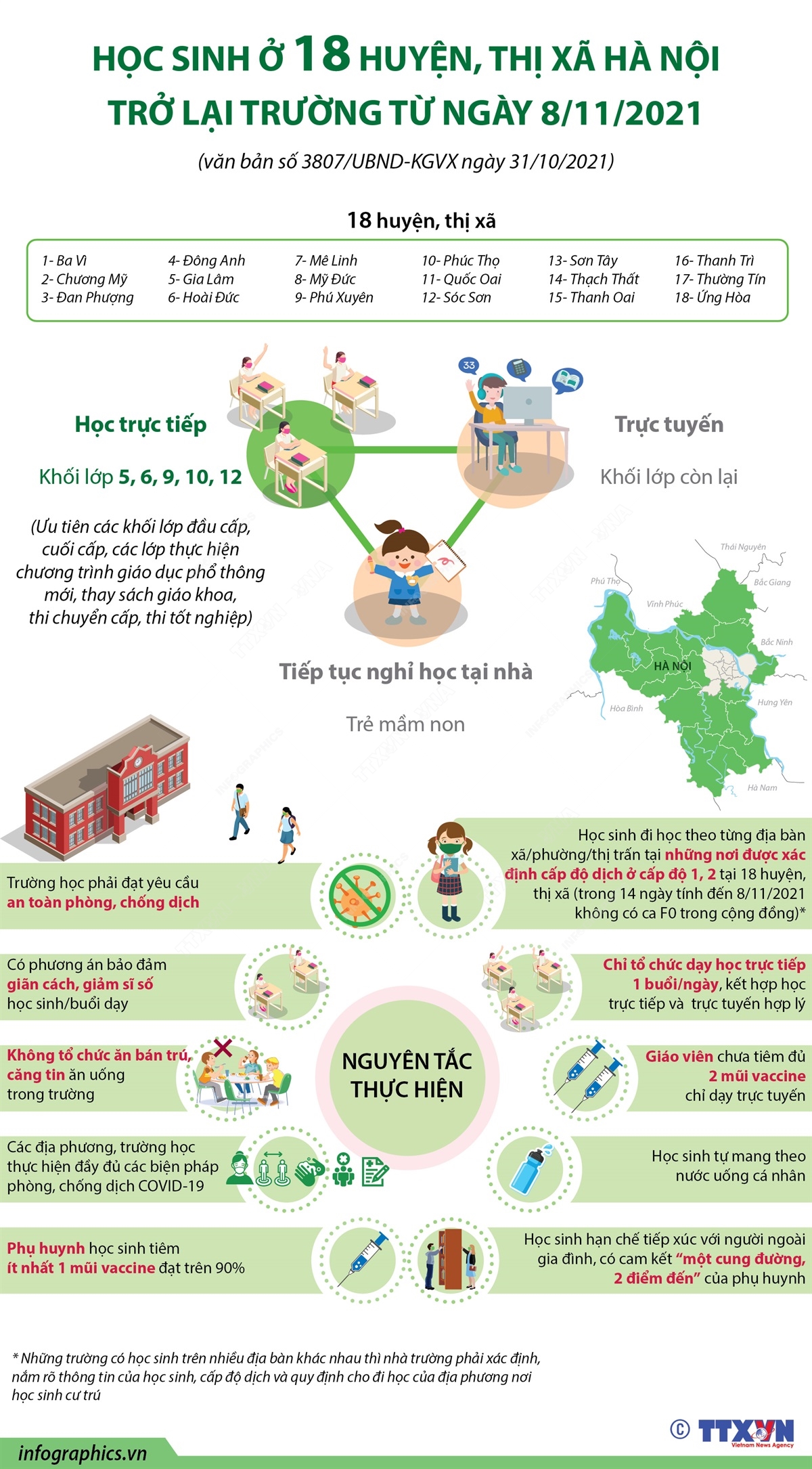Phổ biến giáo dục Pháp luậtThông tin đồ họa Học sinh ở 18 huyện, thị xã Hà Nội trở lại trường từ ngày 8/11/2021 Thứ năm, 04/11/2021 13:44 UBND thành phố Hà Nội vừa quyết định cho học sinh trở lại trường từ ngày 8/11/2021 sau thời gian tạm dừng đến trường để phòng, chống dịch COVID-19 (văn bản số 3807/UBND-KGVX ngày 31/10/2021)