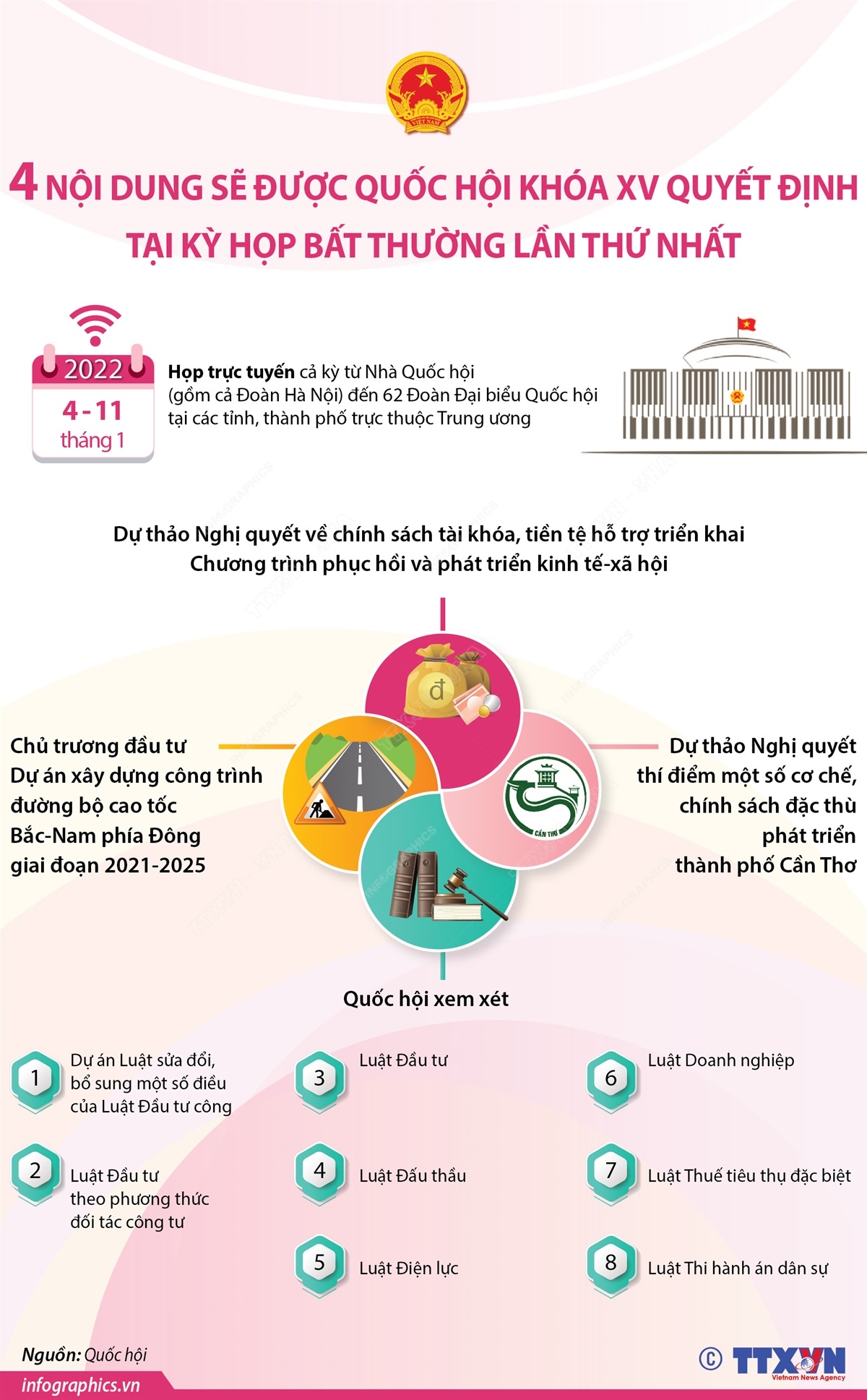 Tin cùng chuyên mục Kỳ họp bất thường lần thứ nhất, Quốc hội khóa XV hoàn thành toàn bộ chương trình đề ra13/01/2022 16:05Kỳ họp bất thường lần thứ nhất, Quốc hội khóa XV tháng 1/2022 đã hoàn thành toàn bộ chương trình đề ra. Với gần 1.100 lượt đại biểu phát biểu qua 3 phiên thảo luận Tổ và 3 phiên họp toàn thể trực tuyến, các vị đại biểu Quốc hội đã tập trung nghiên cứu, thảo luận sôi nổi, đóng góp rất nhiều ý kiến sâu sắc, tâm huyết, chất lượng, có tính xây dựng các... Lịch Nghỉ Tết Nguyên đán Nhâm Dần 202213/01/2022 16:05Lịch nghỉ Tết Nguyên đán Nhâm Dần 2022 của công chức, viên chức kéo dài 9 ngày liên tục, từ thứ Bảy 29/1/2022 đến hết ngày Chủ Nhật 6/2/2022, gồm 5 ngày nghỉ Tết theo Bộ Luật Lao động và 4 ngày nghỉ hàng tuần. Nhìn lại một số vụ “đại án” được đưa ra xét xử năm 202111/01/2022 10:15Năm 2021 tiếp tục là một năm Đảng, Nhà nước quyết liệt thực hiện công tác phòng, chống tham nhũng. Nhiều vụ đại án kinh tế, tham nhũng đã được phát hiện, đấu tranh, điều tra, truy tố và đưa ra xét xử, hàng loạt cán bộ chủ chốt, nguyên là lãnh đạo cấp cao vi phạm bị xử lý hình sự với những bản án nghiêm khắc. Những nhiệm vụ, giải pháp chủ yếu phát triển kinh tế-xã hội năm 202210/01/2022 10:06Chính phủ vừa ban hành Nghị quyết 01/NQ-CP ngày 8/1/2022 về nhiệm vụ, giải pháp chủ yếu thực hiện Kế hoạch phát triển kinh tế-xã hội và Dự toán ngân sách nhà nước năm 2022. Theo đó, chủ đề điều hành năm 2022 là “Đoàn kết kỷ cương, chủ động thích ứng, an toàn hiệu quả, phục hồi phát triển”. Với 12 nhiệm vụ, giải pháp chủ yếu, Chính phủ phấn đấu tăng... 4 nội dung sẽ được Quốc hội khóa XV quyết định tại Kỳ họp bất thường lần thứ nhất07/01/2022 17:00Kỳ họp bất thường lần thứ nhất, Quốc hội khóa XV diễn ra từ 4 đến 11/1/2022 theo hình thức trực tuyến cả kỳ qua cầu truyền hình từ Nhà Quốc hội (gồm cả Đoàn Hà Nội) tới 62 Đoàn Đại biểu Quốc hội tại các tỉnh, thành phố trực thuộc Trung ương. Tại kỳ họp này, Quốc hội sẽ xem xét, thông qua Luật sửa đổi, bổ sung một số điều của Luật Đầu tư công, Luật... Từ 1/1/2022: Hiệp định Đối tác Kinh tế Toàn diện Khu vực (RCEP) chính thức có hiệu lực07/01/2022 13:56Hiệp định Đối tác Kinh tế Toàn diện Khu vực (RCEP) - Hiệp định Thương mại Tự do (FTA) có quy mô lớn nhất thế giới giữa ASEAN và 5 nước đối tác chính thức có hiệu lực. Đây là hiệp định thương mại tự do châu Á-Thái Bình Dương tạo ra khối thương mại lớn nhất thế giới theo quy mô kinh tế.