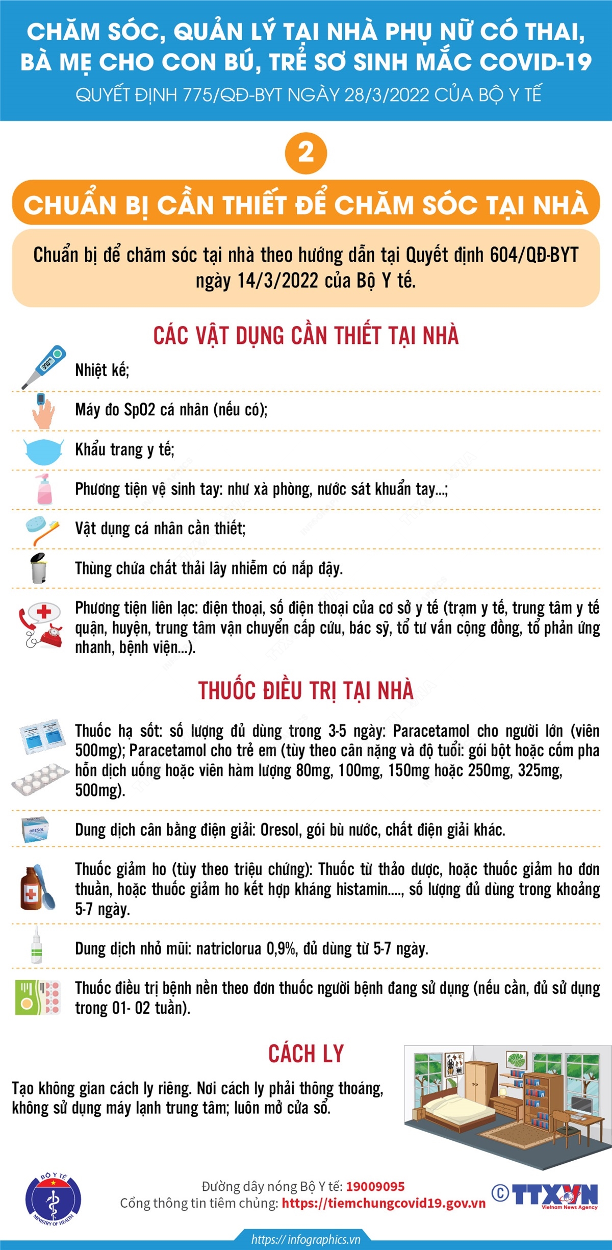 Tin cùng chuyên mục Chăm sóc sức khỏe tại nhà bà mẹ trong thời kỳ hậu sản và bà mẹ cho con bú mắc COVID-1904/04/2022 15:05Bà mẹ trong thời kỳ hậu sản và bà mẹ cho con bú mắc COVID-19 khi chăm sóc sức khỏe tại nhà cần theo dõi sản dịch, co hồi tử cung và phát hiện các dấu hiệu bất thường về sản khoa... Chăm sóc thiết yếu cho trẻ sơ sinh mắc COVID-19 tại nhà04/04/2022 15:05Không nhất thiết phải làm xét nghiệm thường xuyên test nhanh kháng nguyên hoặc RT-PCR SARS-CoV-2 cho tất cả trẻ sơ sinh, kể cả khi người chăm sóc trẻ mắc COVID-19. Theo dõi sức khỏe hàng ngày trẻ sơ sinh mắc COVID-19 tại nhà04/04/2022 11:23Khi chăm sóc sức khỏe trẻ sơ sinh mắc COVID-19 tại nhà cần theo dõi sức khỏe trẻ hàng ngày: Theo dõi dấu hiệu toàn trạng của trẻ, đo thân nhiệt ít nhất 2 lần/ngày, đếm nhịp thở và đo SpO2 (nếu có máy) 2 lần/ngày... Chăm sóc sức khỏe phụ nữ có thai mắc COVID-19 tại nhà04/04/2022 11:23Khi chăm sóc sức khỏe phụ nữ có thai mắc COVID-19 tại nhà cần chú ý theo dõi sức khỏe, các dấu hiệu cấp cứu hoặc bất thường sản khoa, quản lý thai và chăm sóc thai nghén. Tiêu chí được chăm sóc tại nhà phụ nữ có thai và trẻ sơ sinh mắc COVID-1904/04/2022 11:23Tiêu chí được chăm sóc tại nhà của phụ nữ có thai mắc COVID-19 là chưa có chỉ định chấm dứt thai kỳ, chưa có dấu hiệu chuyển dạ không có một trong các dấu hiệu cấp cứu hoặc bất thường sản khoa... Chuẩn bị cần thiết để chăm sóc phụ nữ có thai, bà mẹ cho con bú, trẻ sơ sinh mắc COVID-19 tại nhà04/04/2022 11:23Để chăm sóc phụ nữ có thai, bà mẹ cho con bú, trẻ sơ sinh mắc COVID-19 tại nhà cần có: Nhiệt kế, khẩu trang y tế, phương tiện vệ sinh tay, phương tiện liên lạc, thuốc hạ sốt, dung dịch cân bằng điện giải, thuốc điều trị bệnh nền theo đơn thuốc người bệnh đang sử dụng...