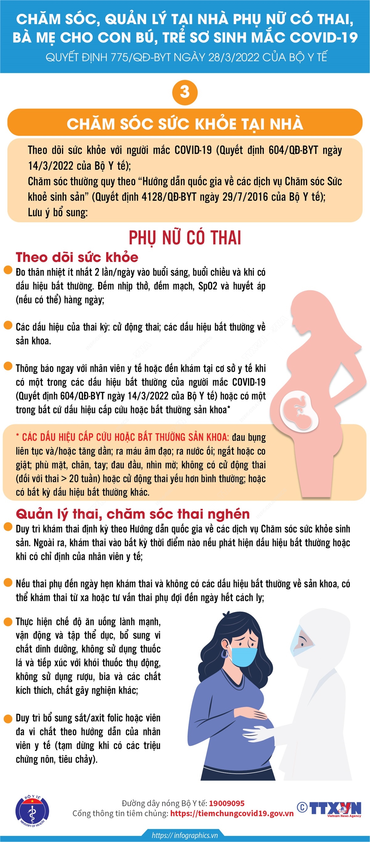 Tin cùng chuyên mục Hướng dẫn sử dụng thuốc tại nhà cho phụ nữ có thai và bà mẹ cho con bú mắc COVID-1904/04/2022 15:05Không tự ý dùng thuốc kháng vi rút, kháng sinh, kháng viêm cho phụ nữ có thai và ba mẹ cho con bú mắc COVID-19 khi chưa có chỉ định, kê đơn khi chăm sóc sức khỏe tại nhà. Chăm sóc sức khỏe tại nhà bà mẹ trong thời kỳ hậu sản và bà mẹ cho con bú mắc COVID-1904/04/2022 15:05Bà mẹ trong thời kỳ hậu sản và bà mẹ cho con bú mắc COVID-19 khi chăm sóc sức khỏe tại nhà cần theo dõi sản dịch, co hồi tử cung và phát hiện các dấu hiệu bất thường về sản khoa... Chăm sóc thiết yếu cho trẻ sơ sinh mắc COVID-19 tại nhà04/04/2022 15:05Không nhất thiết phải làm xét nghiệm thường xuyên test nhanh kháng nguyên hoặc RT-PCR SARS-CoV-2 cho tất cả trẻ sơ sinh, kể cả khi người chăm sóc trẻ mắc COVID-19. Theo dõi sức khỏe hàng ngày trẻ sơ sinh mắc COVID-19 tại nhà04/04/2022 11:23Khi chăm sóc sức khỏe trẻ sơ sinh mắc COVID-19 tại nhà cần theo dõi sức khỏe trẻ hàng ngày: Theo dõi dấu hiệu toàn trạng của trẻ, đo thân nhiệt ít nhất 2 lần/ngày, đếm nhịp thở và đo SpO2 (nếu có máy) 2 lần/ngày... Chăm sóc sức khỏe phụ nữ có thai mắc COVID-19 tại nhà04/04/2022 11:23Khi chăm sóc sức khỏe phụ nữ có thai mắc COVID-19 tại nhà cần chú ý theo dõi sức khỏe, các dấu hiệu cấp cứu hoặc bất thường sản khoa, quản lý thai và chăm sóc thai nghén. Tiêu chí được chăm sóc tại nhà phụ nữ có thai và trẻ sơ sinh mắc COVID-1904/04/2022 11:23Tiêu chí được chăm sóc tại nhà của phụ nữ có thai mắc COVID-19 là chưa có chỉ định chấm dứt thai kỳ, chưa có dấu hiệu chuyển dạ không có một trong các dấu hiệu cấp cứu hoặc bất thường sản khoa...