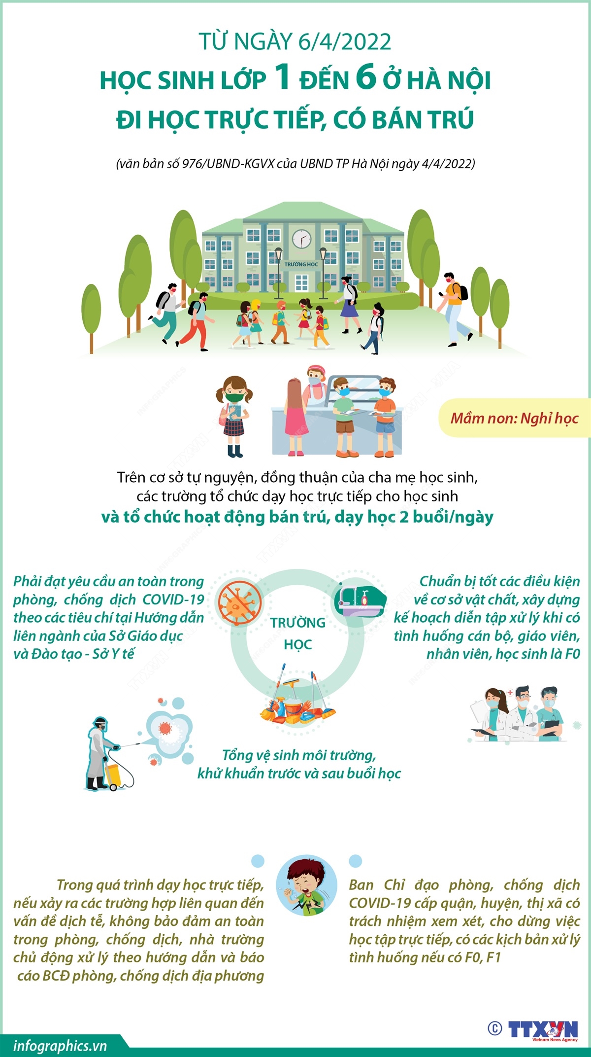 Phổ biến giáo dục Pháp luậtThông tin đồ họa Trẻ mầm non ở Hà Nội quay trở lại trường từ ngày 13/4/2022 Thứ ba, 12/04/2022 08:41 Ngày 8/4/2022, UBND thành phố Hà Nội có văn bản số 1052/UBND-KGVX gửi Sở Giáo dục và Đào tạo, Sở Y tế UBND các quận, huyện, thị xã, thống nhất về nguyên tắc theo đề xuất tại Tờ trình số 917/TTr-SGDĐT ngày 8/4/2022 của Sở Giáo dục và Đào tạo về việc cho trẻ Mầm non được trở lại trường học trực tiếp cho phép các trung tâm khác thực hiện nhiệm vụ giáo dục thường xuyên thuộc 30 quận, huyện, thị xã được tổ chức các hoạt động giáo dục sau thời gian tạm dừng đến trường để phòng, chống dịch COVID-19.
