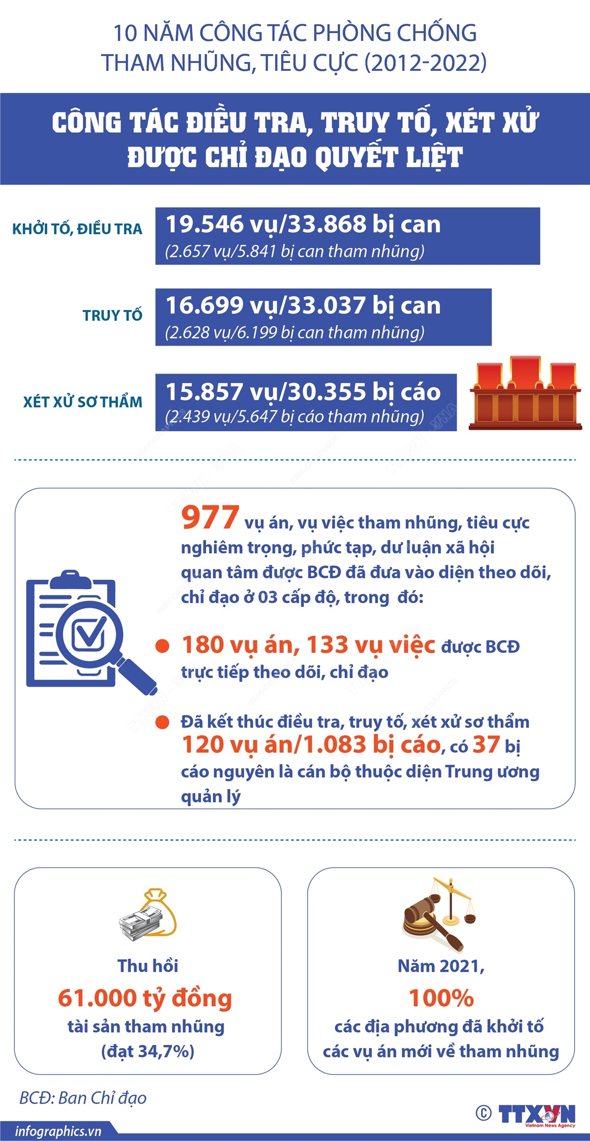 Tin cùng chuyên mục Năm học 2022-2023: Hà Nội tuyển sinh trẻ 5 tuổi, lớp 1, lớp 6 theo hình thức trực tuyến và trực tiếp01/07/2022 09:59Năm học 2022-2023, công tác tuyển sinh vào các trường mầm non, lớp 1, lớp 6 ở Hà Nội tiếp tục được giữ ổn định như năm học trước. Theo đó, các trường thực hiện phương thức xét tuyển theo tuyến tuyển sinh do UBND quận, huyện, thị xã quy định, đồng thời tiếp tục sử dụng phần mềm hỗ trợ tuyển sinh trực tuyến trên toàn thành phố. Kiện toàn về tổ chức, bổ sung chức năng, nhiệm vụ của BCĐ và các cơ quan, đơn vị chức năng PCTN, TC01/07/2022 09:59Từ khi thành lập Ban Chỉ đạo (tháng 2/2013) đến nay, công tác phòng chống tham nhũng đã có bước tiến mạnh, đột phá, trong đó, chú trọng kiện toàn về tổ chức, bổ sung chức năng, nhiệm vụ, nâng cao hiệu quả hoạt động của Ban Chỉ đạo và các cơ quan, đơn vị chức năng phòng chống tham nhũng, tiêu cực. Đổi mới, tăng cường tuyên truyền, giáo dục về phòng chống tham nhũng, tiêu cực01/07/2022 09:59Công tác thông tin tuyên truyền, giáo dục về PCTN,TC được đổi mới, tăng cường; vai trò của Mặt trận tổ quốc, nhân dân và báo chí trong PCTN,TC được phát huy tốt hơn. Công tác cán bộ có nhiều đổi mới, dân chủ, công khai, minh bạch01/07/2022 09:59Công tác cán bộ cải cách hành chính, công khai, minh bạch, trách nhiệm giải trình trong hoạt động của các cơ quan, tổ chức, đơn vị và các giải pháp phòng ngừa tham nhũng, tiêu cực được chú trọng và đạt những kết quả tích cực. Trong 10 năm qua, đã có 8.445.300 lượt người kê khai tài sản (đạt 99,5%) các bộ, ngành, địa phương đã tổ chức kiểm tra việc... Từng bước hoàn thiện cơ chế phòng ngừa chặt chẽ để “không thể tham nhũng, tiêu cực”01/07/2022 09:59Công tác xây dựng, hoàn thiện thể chế được quan tâm hơn, từng bước hoàn thiện cơ chế phòng ngừa chặt chẽ để “không thể tham nhũng, tiêu cực”. Ban Chấp hành Trung ương, Bộ Chính trị, Ban Bí thư đã ban hành hơn 250 văn bản về xây dựng Đảng, xây dựng hệ thống chính trị và phòng chống tham nhũng Quốc hội đã sửa đổi, bổ sung, ban hành mới hơn 300 luật,... Công tác điều tra, truy tố, xét xử được chỉ đạo quyết liệt01/07/2022 09:59Công tác điều tra, truy tố, xét xử được chỉ đạo quyết liệt, thực hiện đúng quan điểm “không có vùng cấm, không có ngoại lệ, bất kể người đó là ai”, tạo bước đột phá trong công tác phòng chống tham nhũng, tiêu cực. Trong 10 năm qua, các cơ quan tiến hành tố tụng cả nước đã khởi tố, điều tra 19.546 vụ/33.868 bị can, truy tố 16.699 vụ/33.037 bị can,...