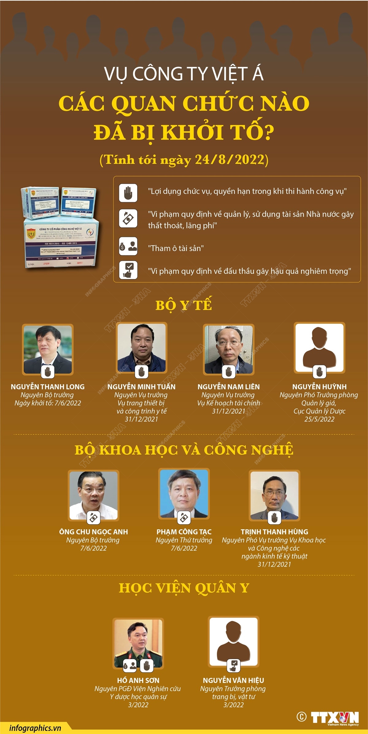 Tin cùng chuyên mục Đường lây truyền của bệnh Đậu mùa khỉ26/08/2022 15:00Bệnh Đậu mùa khỉ lây truyền từ động vật sang người và lây truyền từ người sang người. Thời gian ủ bệnh thường từ 6-13 ngày, dao động từ 5-21 ngày. Bệnh có thể tự khỏi trong vòng 2-3 tuần. Bệnh Đậu mùa khỉ26/08/2022 15:00Bệnh Đậu mùa khỉ được ghi nhận lần đầu tiên năm 1958 trên các đàn khỉ được nuôi để nghiên cứu. Bệnh Đậu mùa khỉ ở người ghi nhận năm 1970 tại Cộng hòa Dân chủ Công Gô, trở thành bệnh lưu hành ở khu vực Trung Phi và Tây Phi. Vụ Công ty Việt Á: Cán bộ, nhân viên y tế nào đã bị khởi tố? (Bài 4)25/08/2022 10:33Tính đến ngày 24/8/2022, Cơ quan điều tra các cấp đã khởi tố hơn 90 bị can liên quan đến vụ nâng khống giá sinh phẩm xét nghiệm COVID-19 xảy ra tại Công ty cổ phần công nghệ Việt Á (Công ty Việt Á), Trung tâm kiểm soát bệnh tật tỉnh Hải Dương (CDC Hải Dương) và các đơn vị, địa phương liên quan, trong đó có hàng chục nhân viên y tế. Vụ Công ty Việt Á: Lãnh đạo Trung tâm Kiểm soát bệnh tật (CDC) các tỉnh, thành nào đã bị khởi tố? (Bài 3)25/08/2022 10:33Tính đến ngày 24/8/2022, Cơ quan điều tra các cấp đã khởi tố hơn 90 bị can liên quan đến vụ nâng khống giá sinh phẩm xét nghiệm COVID-19 xảy ra tại Công ty cổ phần công nghệ Việt Á (Công ty Việt Á), Trung tâm kiểm soát bệnh tật tỉnh Hải Dương (CDC Hải Dương) và các đơn vị, địa phương liên quan, trong đó có hơn 40 bị can thuộc Trung tâm kiểm soát... Vụ Công ty Việt Á: Các quan chức nào đã bị khởi tố? (Bài 2)25/08/2022 10:33Tính đến ngày 24/8/2022, Cơ quan điều tra các cấp đã khởi tố hơn 90 bị can liên quan đến vụ nâng khống giá sinh phẩm xét nghiệm COVID-19 xảy ra tại Công ty cổ phần công nghệ Việt Á (Công ty Việt Á), Trung tâm kiểm soát bệnh tật tỉnh Hải Dương (CDC Hải Dương) và các đơn vị, địa phương liên quan, trong đó có nhiều quan chức thuộc Bộ Khoa học và Công... Vụ Công ty Việt Á: Các quan chức nào đã bị khởi tố? (Bài 2)25/08/2022 10:33Tính đến ngày 24/8/2022, Cơ quan điều tra các cấp đã khởi tố hơn 90 bị can liên quan đến vụ nâng khống giá sinh phẩm xét nghiệm COVID-19 xảy ra tại Công ty cổ phần công nghệ Việt Á (Công ty Việt Á), Trung tâm kiểm soát bệnh tật tỉnh Hải Dương (CDC Hải Dương) và các đơn vị, địa phương liên quan, trong đó có nhiều quan chức thuộc Bộ Khoa học và Công...