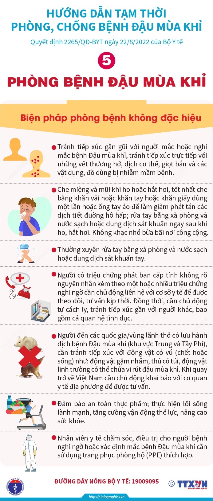 Tin cùng chuyên mục Các trường hợp bắt buộc phải sử dụng khẩu trang (Bài 2)09/09/2022 13:43Nhằm phòng, chống sự lây lan của dịch COVID-19 trong cộng đồng nhằm thích ứng an toàn, linh hoạt, kiểm soát hiệu quả dịch bệnh trong tình hình mới, ngày 6/9/2022, Bộ Y tế ban hành Quyết định 2447/QĐ-BYT 2022 Hướng dẫn sử dụng khẩu trang phòng, chống dịch COVID-19 tại nơi công cộng, trong đó quy định các trường hợp bắt buộc phải đeo khẩu trang tại... Các trường hợp bắt buộc phải sử dụng khẩu trang (Bài 1)09/09/2022 13:43Nhằm phòng, chống sự lây lan của dịch COVID-19 trong cộng đồng nhằm thích ứng an toàn, linh hoạt, kiểm soát hiệu quả dịch bệnh trong tình hình mới, ngày 6/9/2022, Bộ Y tế ban hành Quyết định 2447/QĐ-BYT 2022 Hướng dẫn sử dụng khẩu trang phòng, chống dịch COVID-19 tại nơi công cộng, trong đó quy định các trường hợp bắt buộc phải đeo khẩu trang tại... Các chỉ tiêu cụ thể phát triển kinh tế-xã hội vùng Trung du và miền núi Bắc Bộ30/08/2022 16:18Nghị quyết số 11-NQ/TW ngày 10/2/2022 của Bộ Chính trị về phương hướng phát triển kinh tế - xã hội, bảo đảm quốc phòng, an ninh vùng Trung du và miền núi Bắc Bộ đến năm 2030, tầm nhìn đến năm 2045 xác định rất rõ mục tiêu tổng quát và một số chỉ tiêu cụ thể đến năm 2030 và tầm nhìn đến năm 2045, thể hiện rõ khát vọng, ý chí và quyết tâm rất cao của... Tóm tắt Văn bản pháp luật mới: Số 34 ngày 29/8/2022 của Hội đồng phối hợp phổ biến, giáo dục pháp luật - TTXVN29/08/2022 14:47 Phòng bệnh Đậu mùa khỉ (2)26/08/2022 15:00Vắc xin Đậu mùa trước đây có hiệu quả nhất định trong việc phòng chống bệnh Đậu mùa khỉ. Hiện một số ít quốc gia đã phê duyệt sử dụng vắc xin phòng bệnh Đậu mùa/Đậu mùa khỉ thế hệ mới (thế hệ 2, 3) để phòng chống bệnh Đậu mùa khỉ. Phòng bệnh Đậu mùa khỉ (1)26/08/2022 15:00Một trong những biện pháp phòng bệnh không đặc hiệu là tránh tiếp xúc gần gũi với người mắc hoặc nghi mắc bệnh Đậu mùa khỉ tránh tiếp xúc trực tiếp với những vết thương hở, dịch cơ thể, giọt bắn và các vật dụng, đồ dùng bị nhiễm mầm bệnh.