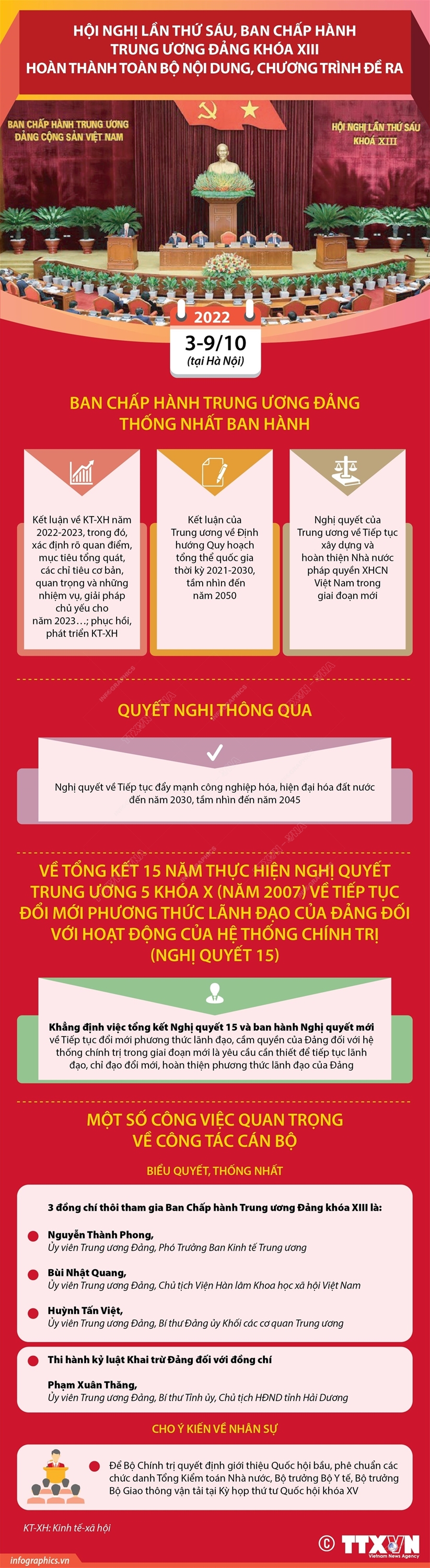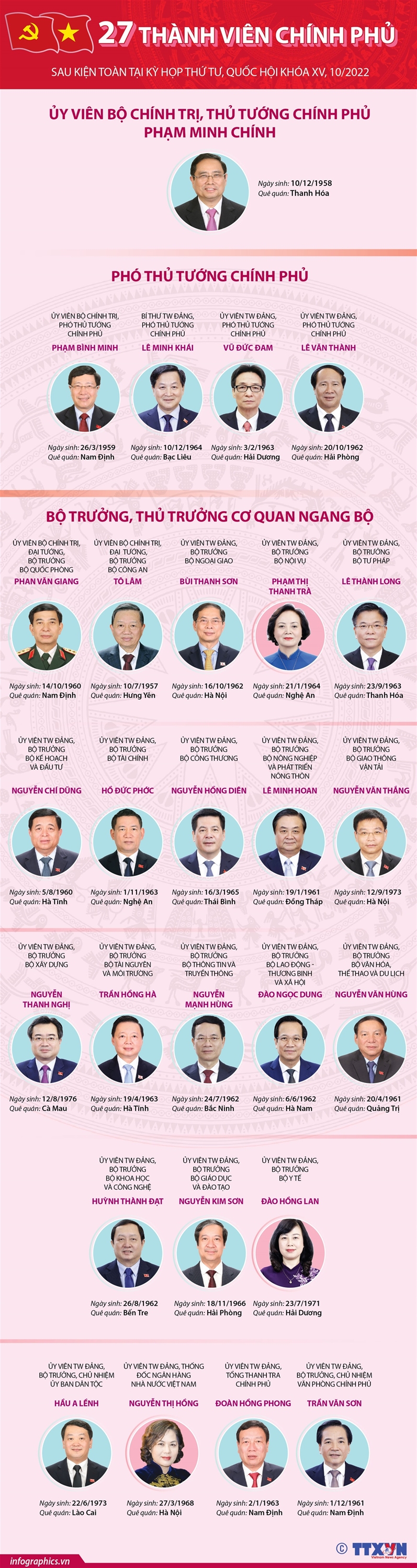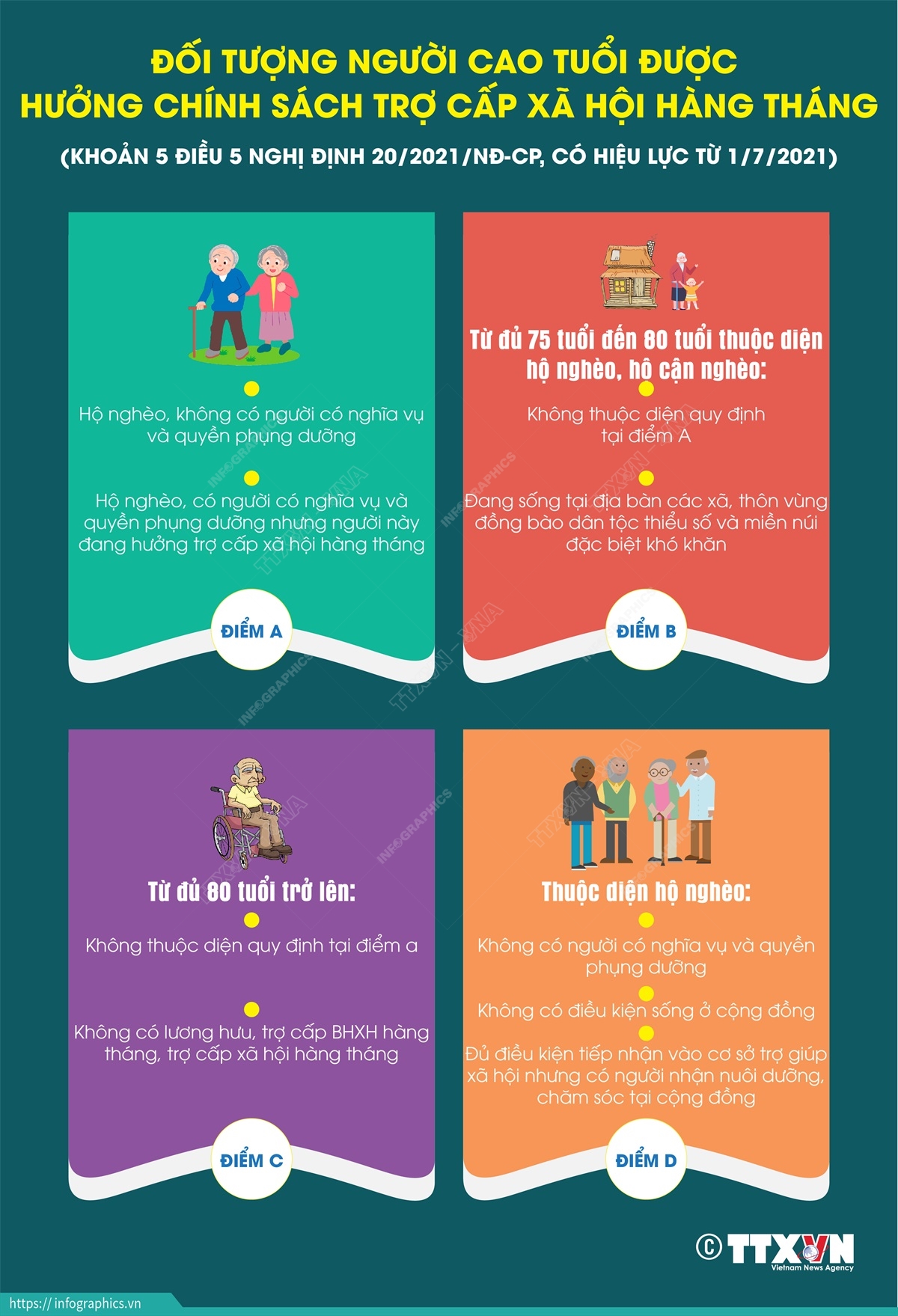 Tin cùng chuyên mục TTXVN tiếp tục trúng cử vào Ban Chấp hành OANA nhiệm kỳ 2022 - 202531/10/2022 08:48Ngày 25/10/2022, tại thủ đô Tehran của Iran, Đại hội đồng lần thứ 18 của Tổ chức các hãng thông tấn châu Á - Thái Bình Dương (OANA) đã bế mạc, bầu hãng thông tấn IRNA (Iran) làm Chủ tịch OANA nhiệm kỳ 2022-2025 và thông qua Tuyên bố Tehran. TTXVN tiếp tục trúng cử vào Ban Chấp hành OANA nhiệm kỳ 2022 - 2025. Phát triển kinh tế-xã hội vùng Đông Nam Bộ đến năm 2030, tầm nhìn đến năm 204531/10/2022 08:48Vùng Đông Nam Bộ có vai trò, vị trí chiến lược đặc biệt quan trọng về chính trị, kinh tế, văn hóa, xã hội, quốc phòng, an ninh và đối ngoại của cả nước. Tầm nhìn đến năm 2045, xây dựng Đông Nam Bộ trở thành vùng phát triển, có tiềm lực kinh tế mạnh, cơ cấu kinh tế hiện đại trung tâm khoa học-công nghệ và đổi mới sáng tạo, công nghiệp công nghệ cao,... 27 thành viên Chính phủ (sau kiện toàn tại kỳ họp thứ tư, Quốc hội khóa XV)31/10/2022 08:48Chiều 21/10/2022, tại kỳ họp thứ tư, Quốc hội khóa XV, các đại biểu Quốc hội đã bỏ phiếu bầu bà Đào Hồng Lan giữ chức Bộ trưởng Bộ Y tế ông Nguyễn Văn Thắng giữ chức Bộ trưởng Bộ Giao thông vận tải. Đối tượng người cao tuổi được hưởng chính sách trợ cấp xã hội hàng tháng14/10/2022 15:03Theo quy định tại khoản 5 Điều 5 Nghị định 20/2021/NĐ-CP ngày 15/3/2021 của Chính phủ, đối tượng người cao tuổi được hưởng chính sách trợ cấp xã hội hàng tháng gồm: Hộ nghèo, không có người có nghĩa vụ và quyền phụng dưỡng Hộ nghèo, có người có nghĩa vụ và quyền phụng dưỡng nhưng người này đang hưởng trợ cấp xã hội hàng tháng Hộ nghèo, không có... 3 nhóm lao động được hưởng lương bằng 1,8 lần mức lương CBCCVC Nhà nước quy định14/10/2022 15:02Theo Quyết định số 19/2022/QĐ-TTg ngày 22/9/2022 của Chính phủ quy định về chi phí quản lý bảo hiểm xã hội, bảo hiểm thất nghiệp, bảo hiểm y tế giai đoạn 2022-2024, mức chi tiền lương đối với cán bộ, công chức, viên chức và người lao động làm việc trong cơ quan bảo hiểm xã hội bằng 1,8 lần mức lương đối với cán bộ, công chức, viên chức do Nhà nước... Hội nghị lần thứ 6, Ban Chấp hành Trung ương Đảng khóa XIII hoàn thành toàn bộ nội dung, chương trình đề ra14/10/2022 15:02Thực hiện Chương trình làm việc toàn khóa, từ ngày 3/10/2022 đến ngày 9/10/2022, tại Thủ đô Hà Nội, Ban Chấp hành Trung ương Đảng khóa XIII họp Hội nghị lần thứ sáu để xem xét thảo luận, cho ý kiến các tờ trình, đề án, báo cáo của Bộ Chính trị liên quan một số vấn đề lớn, cơ bản và quan trọng: (1) Về tình hình kinh tế-xã hội, ngân sách nhà nước năm...
