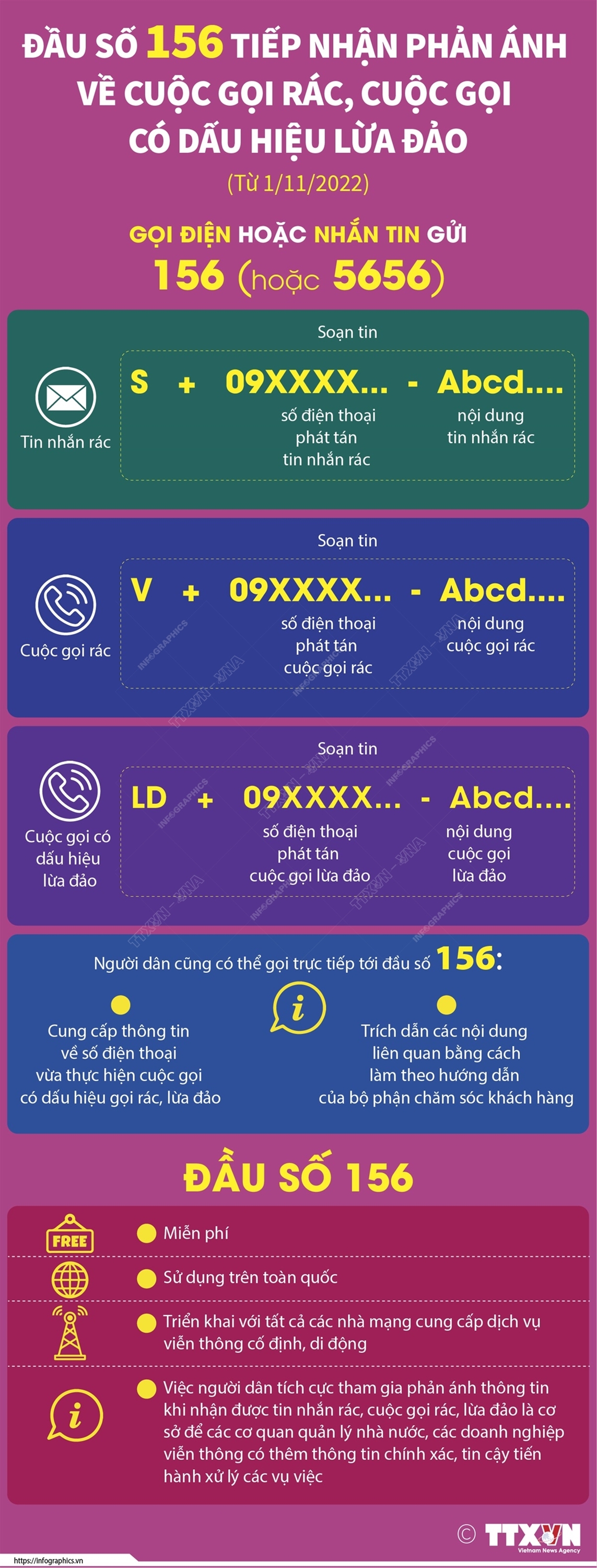 Phổ biến giáo dục Pháp luậtThông tin đồ họa Đầu số 156 tiếp nhận phản ánh về cuộc gọi rác, cuộc gọi có dấu hiệu lừa đảo (từ 1/11/2022) Thứ ba, 08/11/2022 08:34 Bộ Thông tin và Truyền thông cùng các doanh nghiệp viễn thông thống nhất triển khai, mở rộng việc tiếp nhận phản ánh về cuộc gọi rác, cuộc gọi có dấu hiệu lừa đảo thông qua hình thức cuộc gọi tới đầu số 156 từ ngày 1/11/2022. Đầu số 156 được sử dụng thống nhất trên toàn quốc và triển khai với tất cả các nhà mạng cung cấp dịch vụ viễn thông cố định, di động. Khi có cuộc gọi phản ánh, các nhà mạng tiếp nhận, phân loại, xử lý các nội dung này. Về lâu dài, Bộ Thông tin và Truyền thông sẽ đẩy mạnh phối hợp với Bộ Công an để xử lý các hành vi lừa đảo qua cuộc gọi viễn thông.