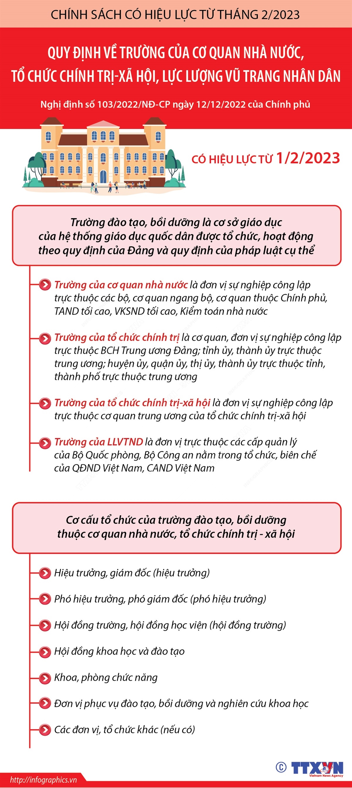 Tin cùng chuyên mục Tết Quý Mão 2023: Trường hợp vi phạm nồng độ cồn bị xử lý tăng gần 600%02/02/2023 11:05Dịp Tết Quý Mão 2023, lực lượng chức năng tăng cường xử lý vi phạm nồng độ cồn nên số vụ tai nạn giao thông liên quan đến bia, rượu giảm. Tuy nhiên đã có 7.726 trường hợp vi phạm về nồng độ cồn bị phát hiện, xử lý, chiếm 35,1% tổng số vi phạm về trật tự, an toàn giao thông, tăng 6.620 trường hợp (tăng 598% so với dịp Tết Nguyên đán Nhâm Dần. Chính sách có hiệu lực từ tháng 2/2023: Giảm 50% lệ phí đăng ký cư trú khi công dân nộp hồ sơ qua Cổng dịch vụ công trực tuyến02/02/2023 11:05Thông tư số 75/2022/TT-BTC của Bộ Tài chính quy định mức thu, chế độ thu, nộp và quản lý lệ phí đăng ký cư trú có hiệu lực từ ngày 5/2/2023. Chính sách có hiệu lực từ tháng 2/2023: Trường hợp mua, chuyển, mang ngoại tệ ra nước ngoài phục vụ mục đích tài trợ, viện trợ của tổ chức02/02/2023 11:05Thông tư số 20/2022/TT-NHNN của Ngân hàng Nhà nước hướng dẫn hoạt động chuyển tiền một chiều từ Việt Nam ra nước ngoài và thanh toán, chuyển tiền cho các giao dịch vãng lai khác của người cư trú là tổ chức, cá nhân có hiệu lực từ ngày 15/2/2023. Thông tư quy định, các trường hợp mua, chuyển, mang ngoại tệ ra nước ngoài để phục vụ mục đích tài trợ,... Chính sách có hiệu lực từ tháng 2/2023: Quy định về trường của cơ quan nhà nước, tổ chức chính trị-xã hội, lực lượng vũ trang nhân dân02/02/2023 11:05Nghị định số 103/2022/NĐ-CP của Chính phủ ngày 12/12/2022, có hiệu lực từ 1/2/2023 quy định về trường của cơ quan nhà nước, tổ chức chính trị, tổ chức chính trị-xã hội, lực lượng vũ trang nhân dân. Chính sách có hiệu lực từ tháng 2/2023: Các trường hợp ký hợp đồng lao động trong cơ quan hành chính, đơn vị sự nghiệp công lập02/02/2023 11:05Nghị định số 111/2022/NĐ-CP ngày 30/12/2022 về hợp đồng đối với một số loại công việc trong cơ quan hành chính và đơn vị sự nghiệp công lập có hiệu lực từ ngày 22/2/2023. Chủ tịch Hồ Chí Minh: Người sáng lập Ðảng Cộng sản Việt Nam30/01/2023 17:12Ra đi tìm đường cứu nước với khát vọng giải phóng dân tộc, lãnh tụ Nguyễn Ái Quốc (Chủ tịch Hồ Chí Minh sau này) đã hoạt động tích cực, khẩn trương và đầy sáng tạo để chuẩn bị cho sự ra đời các tổ chức cộng sản - tiền thân của Đảng Cộng sản Việt Nam.