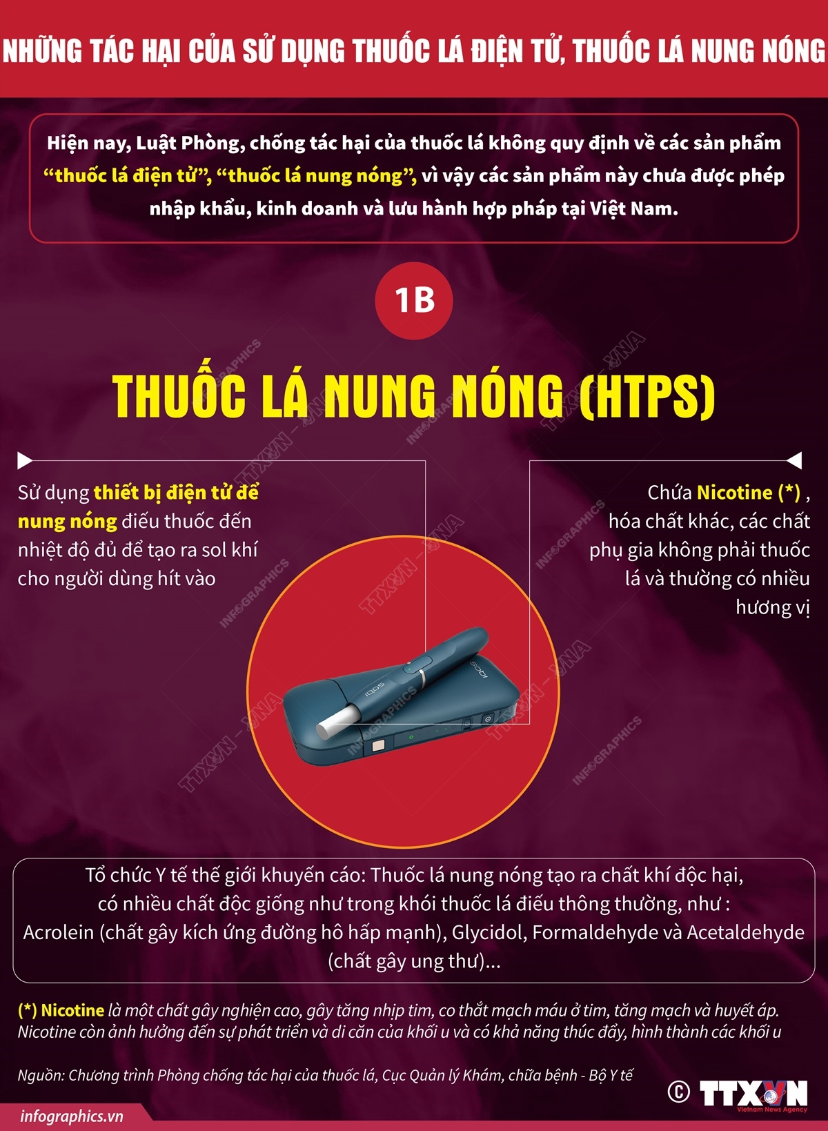 Tin cùng chuyên mục Ảnh hưởng lớn của nicotine đến sức khỏe của thanh thiếu niên29/05/2023 17:44Nicotine ảnh hưởng xấu đến sự phát triển của thanh thiếu niên như: làm suy yếu sự trưởng thành não bộ của thanh thiếu niên với những hậu quả ngắn hạn và hậu quả lâu dài nghiêm trọng đó là nghiện, rối loạn nhận thức và cảm xúc, giảm khả năng học tập và rối loạn tâm thần. Những thay đổi do nicotine gây ra trong hệ thần kinh khiến người dùng ở nhóm... Ảnh hưởng của việc tiếp xúc thụ động với sol khí/khói29/05/2023 17:44Hệ thống cung cấp dung dịch điện tử làm nóng và hóa hơi dung dịch tạo nên sol khí/khói vẫn thải ra môi trường, ảnh hưởng đến chất lượng không khí, đặc biệt tại các nơi trong nhà. Theo Tổ chức Y tế thế giới, phơi nhiễm nicotine tác động bất lợi cho sức khỏe bà mẹ và bào thai trong thời kì thai nghén, gây ra đẻ non, thai chết lưu, tăng nguy cơ mắc... Một số ảnh hưởng tới sức khỏe của thuốc lá điện tử, thuốc lá nung nóng29/05/2023 17:44Thuốc lá điện tử, thuốc lá nung nóng là những sản phẩm mới xuất hiện trong khoảng 10 năm trở lại, bằng chứng khoa học về độc tính và ảnh hưởng sức khỏe lâu dài của các sản phẩm này vẫn đang được tiếp tục nghiên cứu. Tuy nhiên, rất nhiều các nghiên cứu bước đầu đã chỉ ra hậu quả đối với sức khoẻ của việc sử dụng và tiếp xúc thụ động với “sol... Tác hại của thuốc lá nung nóng29/05/2023 17:44Thuốc lá nung nóng (HTPs) sử dụng thiết bị điện tử để nung nóng điếu thuốc đến nhiệt độ đủ để tạo ra sol khí cho người dùng hít vào: chứa nicotine, hóa chất khác, các chất phụ gia không phải thuốc lá và thường có nhiều hương vị. Tác hại của thuốc lá điện tử29/05/2023 17:38Thuốc lá điện tử sử dụng nhiều hương liệu, hóa chất nên có thể bị lợi dụng để sử dụng ma túy thông qua việc phối trộn. Người sử dụng có thể tự ý tăng tỷ lệ nicotine quá mức hoặc thêm ma túy và các chất gây nghiện khác vào để sử dụng mà khó bị phát hiện. Một số khảo sát trong cộng đồng sử dụng thuốc lá điện tử cho thấy rõ ràng về mối liên quan giữa... Nhìn lại 16 lần tăng lương cơ sở15/05/2023 12:23Chính phủ vừa ban hành Nghị định số 24/2023/NĐ-CP ngày 14/5/2023 quy định mức lương cơ sở đối với cán bộ, công chức, viên chức và lực lượng vũ trang. Theo đó, từ ngày 01/7/2023, áp dụng mức lương cơ sở 1,8 triệu đồng/tháng cho 9 nhóm đối tượng.