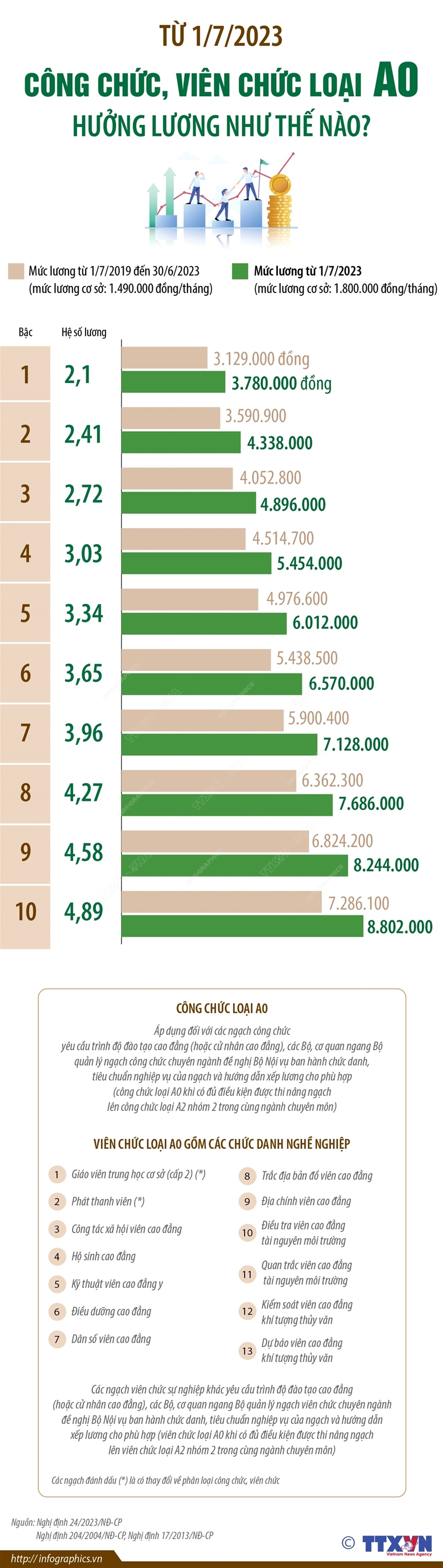 Tin cùng chuyên mục Hà Nội : Học phí các trường công lập năm học 2023-2024 cao nhất 300.000 đồng/tháng11/07/2023 15:41Ngày 4/7/2023, tại kỳ họp thứ mười hai, HĐND TP Hà Nội đã thông qua Nghị quyết Quy định mức thu học phí đối với các cơ sở giáo dục mầm non, giáo dục phổ thông công lập trên địa bàn TP Hà Nội năm học 2023-2024, theo đó quy định mức thu học phí năm học 2023-2024 bằng mức sàn của khung học phí theo quy định của Chính phủ. Tăng lương hưu, trợ cấp bảo hiểm xã hội và trợ cấp hằng tháng từ 1/7/202311/07/2023 15:41Từ 1/7/2023, lương hưu, trợ cấp bảo hiểm xã hội và trợ cấp hằng tháng được điều chỉnh tăng từ 12,5% đến 20,8% theo Nghị định số 42/2023/NĐ-CP ngày 29/6/2023 của Chính phủ. Nghị định này có hiệu lực thi hành từ ngày 14/8/2023. Các quy định tại Nghị định được thực hiện từ ngày 1/7/2023. Từ 1/7/2023 đến 31/12/2023: Thực hiện giảm 2% thuế suất thuế GTGT11/07/2023 15:41Quốc hội đã thông qua Nghị quyết Kỳ họp thứ 5, Quốc hội XV. Trong Nghị quyết này có quy định về việc Thực hiện giảm 2% thuế suất thuế giá trị gia tăng quy định tại tiết a, điểm 1.1, khoản 1 Điều 3 của Nghị quyết số 43/2022/QH15 ngày 11/01/2022 của Quốc hội về chính sách tài khóa, tiền tệ hỗ trợ Chương trình phục hồi và phát triển kinh tế-xã hội... Từ 1/7/2023: Công chức, viên chức loại A3 hưởng lương như thế nào?11/07/2023 15:41Dưới đây là chi tiết mức lương của công chức, viên chức loại A3 từ ngày 1/7/2023. Từ 1/7/2023: Công chức, viên chức loại A1 hưởng lương như thế nào?11/07/2023 15:40Dưới đây là chi tiết mức lương của công chức, viên chức loại A1 từ ngày 1/7/2023. Từ 1/7/2023: Công chức, viên chức loại A0 hưởng lương như thế nào?11/07/2023 15:40Dưới đây là chi tiết mức lương của công chức, viên chức loại A0 từ ngày 1/7/2023.