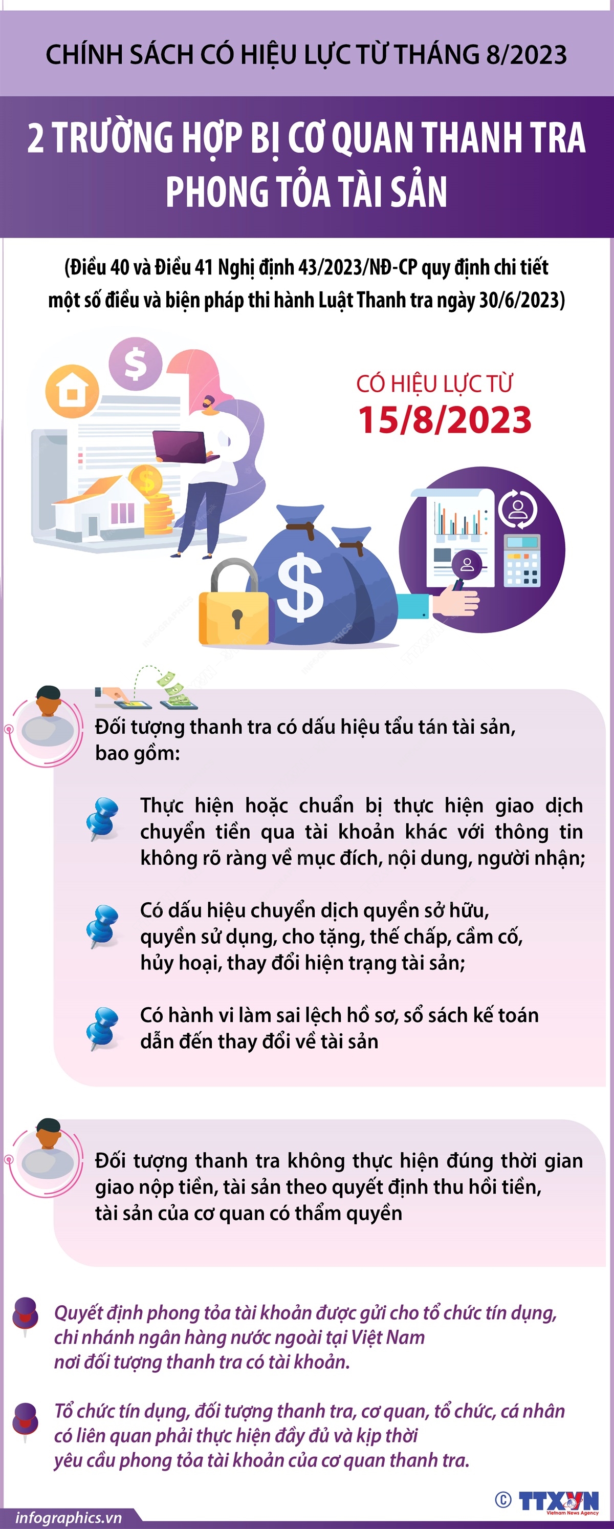 Tin cùng chuyên mục Chính sách thôi việc từ 20/7/202304/08/2023 16:00Điều 7 Nghị định số 29/2023/NĐ-CP ngày 3/6/2023 của Chính phủ có hiệu lực từ ngày 20/7/2023 quy định các đối tượng thôi việc được hưởng các khoản trợ cấp sau: Đối tượng chưa thực hiện tinh giản biên chế từ 20/7/202304/08/2023 16:00Theo Nghị định số 29/2023/NĐ-CP ngày 3/6/2023 của Chính phủ quy định về tinh giản biên chế, những đối tượng chưa thực hiện tinh giản biên chế là: Những người đang trong thời gian mang thai, nghỉ thai sản, đang nuôi con dưới 36 tháng tuổi, trừ trường hợp cá nhân tự nguyện tinh giản biên chế và những người đang trong thời gian xem xét kỷ luật hoặc... Đối tượng thực hiện chính sách tinh giản biên chế từ 20/7/202304/08/2023 16:00Nghị định số 29/2023/NĐ-CP ngày 3/6/2023 của Chính phủ quy định về tinh giản biên chế, có hiệu lực thi hành từ ngày 20/7/2023, trong đó có quy định về Đối tượng thực hiện chính sách tinh giản biên chế. Các chế độ chính sách quy định tại Nghị định này được áp dụng đến hết ngày 31/12/2030. Khung kế hoạch thời gian năm học 2023-2024: Đối với giáo dục mầm non, giáo dục phổ thông và giáo dục thường xuyên04/08/2023 16:00Theo Quyết định số 2171/QĐ-BGDĐT ngày 28/7/2023 của Bộ Giáo dục và Đào tạo về khung kế hoạch thời gian năm học 2023-2024, học sinh mầm non, học sinh giáo dục phổ thông và giáo dục thường xuyên sẽ tựu trường sớm nhất trước 1 tuần so với ngày tổ chức khai giảng. Riêng lớp 1, tựu trường sớm nhất trước 2 tuần so với ngày khai giảng. 2 trường hợp bị cơ quan thanh tra phong tỏa tài sản từ 15/8/202304/08/2023 16:00Theo Điều 40 và Điều 41 của Nghị định 43/2023/NĐ-CP, người ra quyết định thanh tra, Trưởng đoàn thanh tra sẽ ra quyết định phong tỏa tài khoản của đối tượng thanh tra khi có 02 căn cứ sau. Khung giá khám bệnh, khung giá giường điều trị theo yêu cầu từ 15/8/202304/08/2023 15:59Phụ lục 1 Thông tư 13/2023/TT-BYT của Bộ Y tế, có hiệu lực từ 15/8/2023 đã ấn định khung giá dịch vụ khám bệnh theo yêu cầu, khung giá ngày giường điều trị theo yêu cầu tại cơ sở y tế của nhà nước như sau.