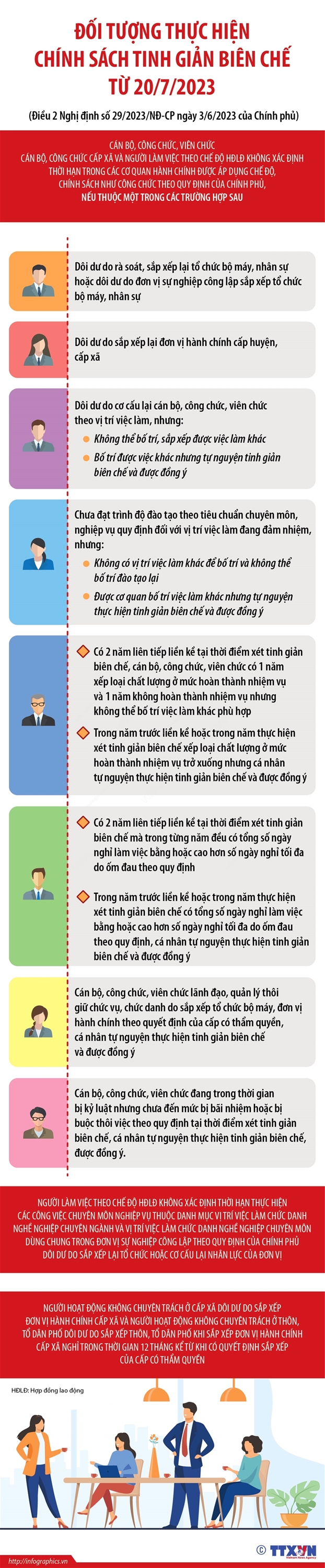 Tin cùng chuyên mục 36 trạm dừng nghỉ trên cao tốc Bắc Nam08/08/2023 14:43Bộ trưởng Bộ Giao thông vận tải vừa có quyết định phê duyệt mạng trạm dừng nghỉ trên tuyến cao tốc Bắc - Nam phía Đông làm cơ sở lập danh mục dự án, lựa chọn nhà đầu tư xây dựng trạm dừng nghỉ. Sẽ có 36 trạm dừng nghỉ được xây dựng phục vụ chủ phương tiện nghỉ ngơi, đổ xăng, ăn uống... khi lưu thông trên tuyến. Hơn 660.000 thí sinh đăng ký xét tuyển đại học 202304/08/2023 16:03Hệ thống đăng ký nguyện vọng xét tuyển đại học năm 2023 của Bộ Giáo dục và Đào tạo đã đóng lúc 17h ngày 30/7/2023 với tổng số >660.000 thí sinh đăng ký xét tuyển, tương đương 66% so với số thí sinh đăng ký dự thi tốt nghiệp THPT năm 2023. Công nghiệp, thương mại Thủ đô chuyển dịch theo hướng tích cực04/08/2023 16:03Sau 15 năm thực hiện Nghị quyết số 15/2008/NQ-QH12 ngày 29/5/2008 của Quốc hội khóa XII về mở rộng địa giới hành chính Hà Nội, công nghiệp, thương mại trên địa bàn Thành phố đã gặt hái được những kết quả nhất định; đóng góp chung vào kết quả phát triển kinh tế của Thủ đô. Chính sách thôi việc từ 20/7/202304/08/2023 16:00Điều 7 Nghị định số 29/2023/NĐ-CP ngày 3/6/2023 của Chính phủ có hiệu lực từ ngày 20/7/2023 quy định các đối tượng thôi việc được hưởng các khoản trợ cấp sau: Đối tượng chưa thực hiện tinh giản biên chế từ 20/7/202304/08/2023 16:00Theo Nghị định số 29/2023/NĐ-CP ngày 3/6/2023 của Chính phủ quy định về tinh giản biên chế, những đối tượng chưa thực hiện tinh giản biên chế là: Những người đang trong thời gian mang thai, nghỉ thai sản, đang nuôi con dưới 36 tháng tuổi, trừ trường hợp cá nhân tự nguyện tinh giản biên chế và những người đang trong thời gian xem xét kỷ luật hoặc... Đối tượng thực hiện chính sách tinh giản biên chế từ 20/7/202304/08/2023 16:00Nghị định số 29/2023/NĐ-CP ngày 3/6/2023 của Chính phủ quy định về tinh giản biên chế, có hiệu lực thi hành từ ngày 20/7/2023, trong đó có quy định về Đối tượng thực hiện chính sách tinh giản biên chế. Các chế độ chính sách quy định tại Nghị định này được áp dụng đến hết ngày 31/12/2030.