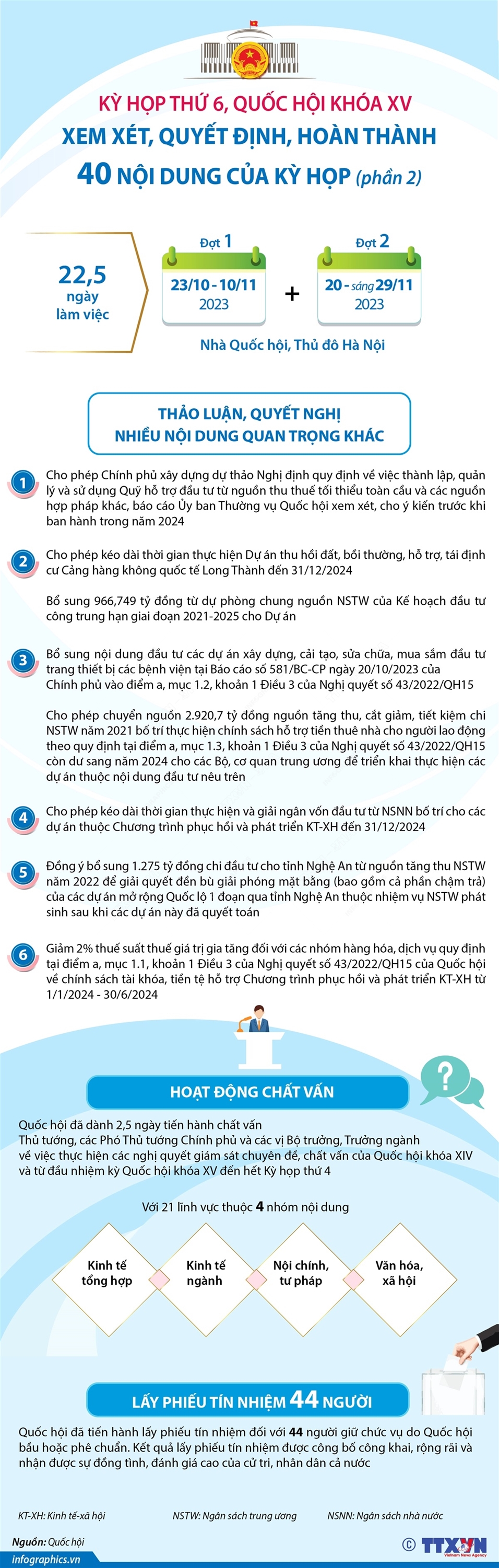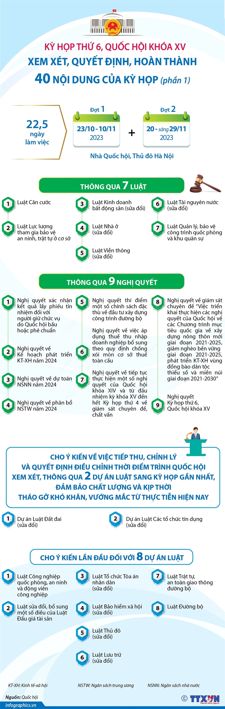 Tin cùng chuyên mục Một số điểm mới của Luật Căn cước: Bổ sung quy định về Giấy chứng nhận căn cước05/12/2023 14:56Ngày 27/11/2023, Quốc hội đã chính thức qua Luật Căn cước. Luật gồm 7 chương, 46 điều, có hiệu lực từ 1/7/2024. Luật bổ sung quy định về Giấy chứng nhận căn cước. Theo đó, Giấy chứng nhận căn cước được cấp cho người gốc Việt Nam chưa xác định được quốc tịch mà đang sinh sống liên tục từ 6 tháng trở lên tại đơn vị hành chính cấp xã hoặc đơn vị hành... Một số điểm mới của Luật Căn cước: Đổi tên thẻ căn cước công dân thành thẻ căn cước05/12/2023 14:56Ngày 27/11/2023, Quốc hội đã chính thức qua Luật Căn cước. Luật gồm 7 chương, 46 điều, có hiệu lực từ 1/7/2024. Song song với việc sửa tên dự án Luật từ Luật Căn cước công dân thành Luật Căn cước thì Quốc hội cũng thống nhất đổi thẻ CCCD thành thẻ Căn cước. Chốt 4 môn thi tốt nghiệp THPT từ năm 202530/11/2023 10:25Ngày 29/11/2023, Bộ Giáo dục và Đào tạo công bố Quyết định số 4068/QĐ-BGDĐT ngày 28/11/2023 về việc phê duyệt “Phương án tổ chức Kỳ thi và xét công nhận tốt nghiệp trung học phổ thông từ năm 2025. Theo đó, từ năm 2025, thí sinh sẽ thi 4 môn với 2 môn bắt buộc và 2 môn lựa chọn. Năm 2025 là năm đầu tiên các học sinh học theo chương trình giáo dục... Có phải đổi thẻ CĂN CƯỚC CÔNG DÂN sang thẻ CĂN CƯỚC?30/11/2023 10:24Ngày 27/11/2023, Quốc hội đã thông qua dự án Luật Căn cước (có hiệu lực kể từ 1/7/2024). Với việc đổi tên gọi từ Luật Căn cước công dân (CCCD) sang Luật Căn cước, thẻ CCCD cũng sẽ có tên gọi mới là Thẻ căn cước. Điều 46 Luật Căn cước quy định, Thẻ căn cước công dân đã được cấp trước ngày Luật này có hiệu lực thi hành có giá trị sử dụng đến hết thời... Kỳ họp thứ 6, Quốc hội khóa XV: Xem xét, quyết định, hoàn thành 40 nội dung của Kỳ họp (phần 2)30/11/2023 10:24Sau 22,5 ngày làm việc với tinh thần tích cực, khẩn trương, nghiêm túc, trách nhiệm, dân chủ, đổi mới, Kỳ họp thứ 6, Quốc hội khóa XV đã xem xét, quyết định, hoàn thành 40 nội dung của Kỳ họp thuộc các lĩnh vực xây dựng pháp luật, giám sát tối cao, quyết định những vấn đề quan trọng của đất nước, thể chế hóa các chủ trương, Nghị quyết của Đảng, góp... Kỳ họp thứ 6, Quốc hội khóa XV: Xem xét, quyết định, hoàn thành 40 nội dung của Kỳ họp (phần 1)30/11/2023 10:24Sau 22,5 ngày làm việc với tinh thần tích cực, khẩn trương, nghiêm túc, trách nhiệm, dân chủ, đổi mới, Kỳ họp thứ 6, Quốc hội khóa XV đã xem xét, quyết định, hoàn thành 40 nội dung của Kỳ họp thuộc các lĩnh vực xây dựng pháp luật, giám sát tối cao, quyết định những vấn đề quan trọng của đất nước, thể chế hóa các chủ trương, Nghị quyết của Đảng, góp...