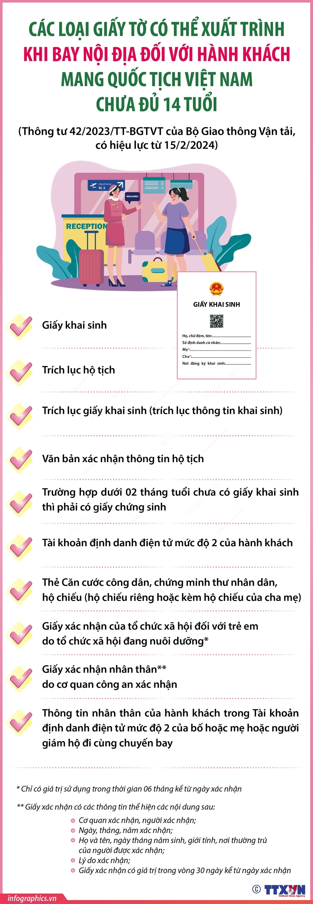 Tin cùng chuyên mục Mục tiêu đến năm 2030: 100% các hồ tự nhiên được đánh giá nguồn lợi thủy sản16/02/2024 15:06Mục tiêu chung của Chương trình quốc gia Bảo vệ và Phát triển nguồn lợi thủy sản đến năm 2030 là bảo tồn, bảo vệ, tái tạo nguồn lợi thủy sản nhằm phục hồi và sử dụng hợp lý, hiệu quả nguồn lợi thủy sản và các hệ sinh thái thủy sinh; gắn hoạt động tuần tra, kiểm tra, kiểm soát, quản lý nguồn lợi thuỷ sản với hoạt động khai thác thủy sản bền vững,... Năm 2024: Hà Nội đặt mục tiêu có 4 huyện đạt chuẩn nông thôn mới nâng cao16/02/2024 15:06Năm 2024, thành phố Hà Nội đề ra mục tiêu hoàn thành nhiệm vụ xây dựng nông thôn mới và có ít nhất 4 huyện được Thủ tướng Chính phủ công nhận huyện đạt chuẩn nông thôn mới nâng cao. Khuyến cáo về di chuyển để đảm bảo an toàn giao thông sau kỳ nghỉ Tết16/02/2024 15:06Theo Công an thành phố Hà Nội, kỳ nghỉ Tết Nguyên đán Giáp Thìn 2024, cán bộ, công chức và người lao động được nghỉ từ ngày 8/2 (tức ngày 29 tháng Chạp năm Quý Mão) đến hết ngày 14/2/2024 (tức ngày mùng 5 tháng Giêng năm Giáp Thìn). Trong các ngày mùng 4, mùng 5 Tết Nguyên đán, đông đảo người dân và phương tiện giao thông trở lại thành phố bắt đầu... Giấy tờ của hành khách sử dụng khi đi tàu bay phải đảm bảo các điều kiện nào?16/02/2024 15:06Theo Thông tư 42/2023/TT-BGTVT của Bộ Giao thông Vận tải, từ 15/2/2024, Giấy tờ của hành khách sử dụng khi đi tàu bay phải đảm bảo các điều kiện: Là bản chính và còn giá trị sử dụng; hoặc bản điện tử có giá trị pháp lý theo quy định; Đối với giấy khai sinh, trích lục hộ tịch; trích lục giấy khai sinh (trích lục thông tin khai sinh); văn bản xác... Các loại giấy tờ có thể xuất trình khi bay nội địa đối với hành khách mang quốc tịch Việt Nam từ đủ 14 tuổi trở lên16/02/2024 15:06Theo Thông tư 42/2023/TT-BGTVT của Bộ Giao thông Vận tải, từ 15/2/2024, hành khách mang quốc tịch Việt Nam từ đủ 14 tuổi trở lên khi làm thủ tục đi tàu bay trên các chuyến bay nội địa phải xuất trình một trong các loại giấy tờ hoặc dữ liệu điện tử có giá trị pháp lý tương đương sau: Các loại giấy tờ có thể xuất trình khi bay nội địa đối với hành khách mang quốc tịch Việt Nam chưa đủ 14 tuổi16/02/2024 15:06Theo Thông tư 42/2023/TT-BGTVT của Bộ Giao thông Vận tải, từ 15/2/2024, hành khách mang quốc tịch Việt Nam chưa đủ 14 tuổi khi làm thủ tục đi tàu bay trên các chuyến bay nội địa phải xuất trình một trong các loại giấy tờ sau: