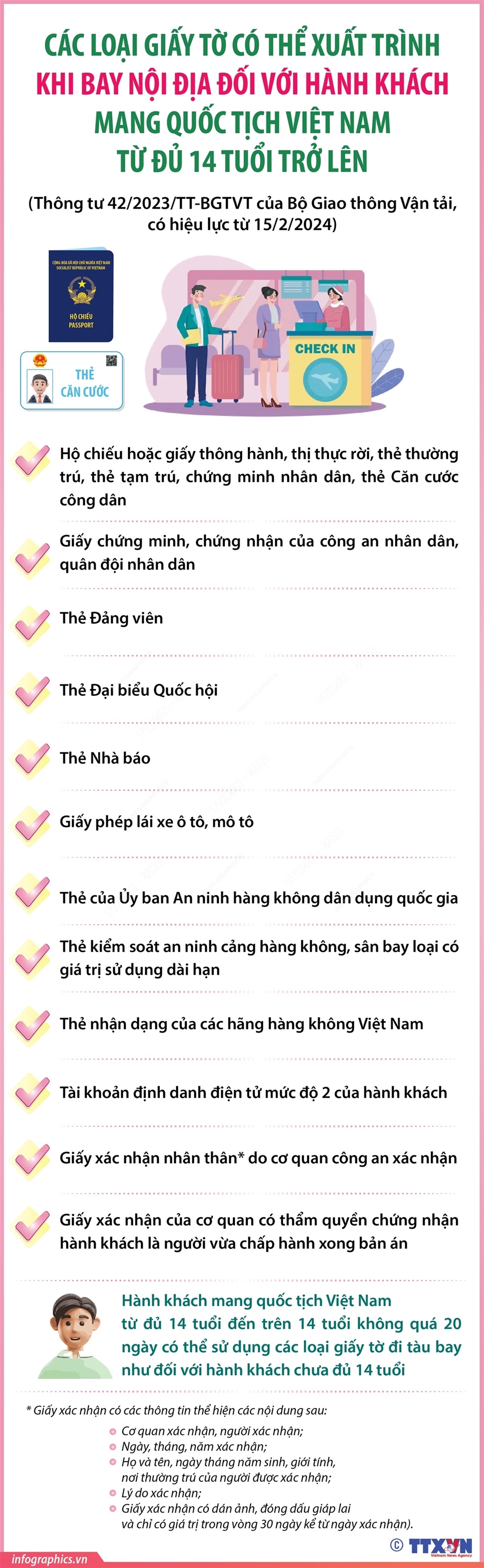 Tin cùng chuyên mục Mục tiêu đến năm 2030, diện tích cao su của cả nước khoảng 800 - 850 nghìn ha16/02/2024 15:06Theo Đề án phát triển cây công nghiệp chủ lực đến năm 2030, Bộ Nông nghiệp và Phát triển nông đặt mục tiêu đến năm 2030, tổng diện tích cao su cả nước đạt khoảng 800 - 850 nghìn ha; 100% lượng mủ và gỗ cao su có mã số vùng trồng truy xuất nguồn gốc sản phẩm... Mục tiêu đến năm 2030: 100% các hồ tự nhiên được đánh giá nguồn lợi thủy sản16/02/2024 15:06Mục tiêu chung của Chương trình quốc gia Bảo vệ và Phát triển nguồn lợi thủy sản đến năm 2030 là bảo tồn, bảo vệ, tái tạo nguồn lợi thủy sản nhằm phục hồi và sử dụng hợp lý, hiệu quả nguồn lợi thủy sản và các hệ sinh thái thủy sinh; gắn hoạt động tuần tra, kiểm tra, kiểm soát, quản lý nguồn lợi thuỷ sản với hoạt động khai thác thủy sản bền vững,... Năm 2024: Hà Nội đặt mục tiêu có 4 huyện đạt chuẩn nông thôn mới nâng cao16/02/2024 15:06Năm 2024, thành phố Hà Nội đề ra mục tiêu hoàn thành nhiệm vụ xây dựng nông thôn mới và có ít nhất 4 huyện được Thủ tướng Chính phủ công nhận huyện đạt chuẩn nông thôn mới nâng cao. Khuyến cáo về di chuyển để đảm bảo an toàn giao thông sau kỳ nghỉ Tết16/02/2024 15:06Theo Công an thành phố Hà Nội, kỳ nghỉ Tết Nguyên đán Giáp Thìn 2024, cán bộ, công chức và người lao động được nghỉ từ ngày 8/2 (tức ngày 29 tháng Chạp năm Quý Mão) đến hết ngày 14/2/2024 (tức ngày mùng 5 tháng Giêng năm Giáp Thìn). Trong các ngày mùng 4, mùng 5 Tết Nguyên đán, đông đảo người dân và phương tiện giao thông trở lại thành phố bắt đầu... Giấy tờ của hành khách sử dụng khi đi tàu bay phải đảm bảo các điều kiện nào?16/02/2024 15:06Theo Thông tư 42/2023/TT-BGTVT của Bộ Giao thông Vận tải, từ 15/2/2024, Giấy tờ của hành khách sử dụng khi đi tàu bay phải đảm bảo các điều kiện: Là bản chính và còn giá trị sử dụng; hoặc bản điện tử có giá trị pháp lý theo quy định; Đối với giấy khai sinh, trích lục hộ tịch; trích lục giấy khai sinh (trích lục thông tin khai sinh); văn bản xác... Các loại giấy tờ có thể xuất trình khi bay nội địa đối với hành khách mang quốc tịch Việt Nam từ đủ 14 tuổi trở lên16/02/2024 15:06Theo Thông tư 42/2023/TT-BGTVT của Bộ Giao thông Vận tải, từ 15/2/2024, hành khách mang quốc tịch Việt Nam từ đủ 14 tuổi trở lên khi làm thủ tục đi tàu bay trên các chuyến bay nội địa phải xuất trình một trong các loại giấy tờ hoặc dữ liệu điện tử có giá trị pháp lý tương đương sau: