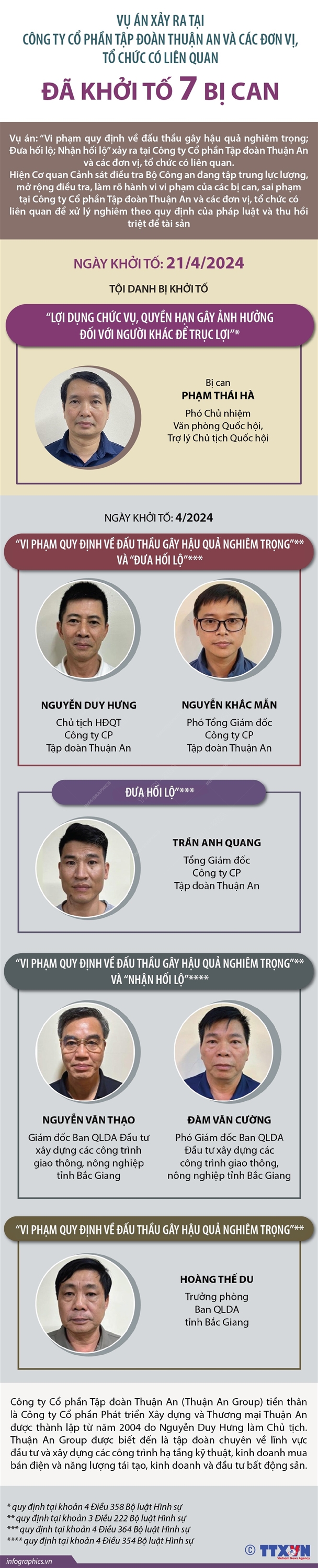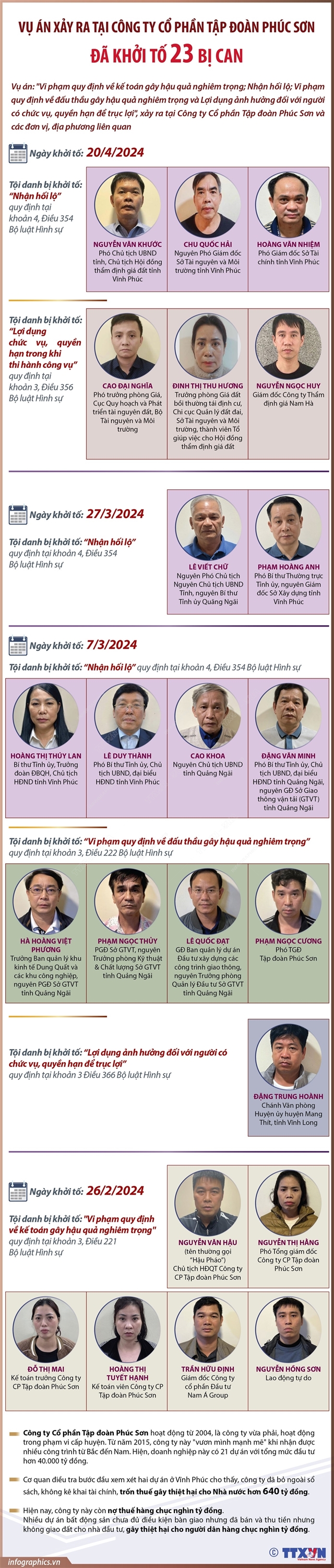 Tin cùng chuyên mục Điều kiện đối với phương tiện cơ giới nước ngoài14/05/2024 14:23Theo Nghị định 30/2024/NĐ-CP ngày 7/3/2024 quy định về quản lý phương tiện giao thông cơ giới đường bộ đăng ký tại nước ngoài, do người nước ngoài đưa vào Việt Nam du lịch, từ ngày 1/5/2024, phương tiện cơ giới nước ngoài vào tham gia giao thông tại Việt Nam phải có Giấy đăng ký xe và gắn biển số xe do cơ quan có thẩm quyền của quốc gia đăng ký xe... Quy định đối với người điều khiển và phương tiện cơ giới nước ngoài khi tham gia giao thông tại Việt Nam14/05/2024 14:20Theo Nghị định 30/2024/NĐ-CP ngày 7/3/2024 quy định về quản lý phương tiện giao thông cơ giới đường bộ đăng ký tại nước ngoài, do người nước ngoài đưa vào Việt Nam du lịch, từ ngày 1/5/2024, người điều khiển và phương tiện cơ giới nước ngoài khi tham gia giao thông tại Việt Nam phải có phương tiện đi trước để hướng dẫn giao thông cho phương tiện cơ... Chiến dịch Hồ Chí Minh lịch sử: Đỉnh cao của cuộc Tổng tiến công và nổi dậy mùa Xuân 1975, mốc son chói lọi trong dòng chảy lịch sử dân tộc26/04/2024 10:56Ngày này cách đây 49 năm, ngày 26/4/1975, Chiến dịch Hồ Chí Minh chính thức mở màn. Đây là chiến dịch quyết chiến chiến lược lớn nhất của quân và dân ta đánh vào trung tâm đầu não quan trọng nhất của chính quyền, quân đội nguỵ ở Sài Gòn-Gia Định và các vùng phụ cận, kết thúc thắng lợi cuộc kháng chiến chống Mỹ, cứu nước của dân tộc. Chiến thắng của... Vụ án xảy ra tại Công ty Cổ phần Tập đoàn Phúc Sơn: Đã khởi tố 23 bị can26/04/2024 10:37 Mở rộng điều tra vụ án "Vi phạm quy định về kế toán gây hậu quả nghiêm trọng; Nhận hối lộ; Vi phạm quy định về đấu thầu gây hậu quả nghiêm trọng và Lợi dụng ảnh hưởng đối với người có chức vụ, quyền hạn để trục lợi", xảy ra tại Công ty Cổ phần Tập đoàn Phúc Sơn và các đơn vị, địa phương liên quan, ngày 20 và 23/4/2024, Cơ quan Cảnh sát điều tra... Đến năm 2030: Tăng thu nhập của lao động sản xuất lâm nghiệp lên gấp 1,5 lần26/04/2024 09:16Đề án Phát triển giá trị đa dụng của hệ sinh thái rừng đến năm 2030, tầm nhìn đến năm 2050 đặt mục tiêu chung là phát triển giá trị đa dụng của hệ sinh thái rừng nhằm nâng cao hiệu quả quản lý, sử dụng bền vững tài nguyên rừng; tạo việc làm, tăng thu nhập, ổn định và nâng cao đời sống vật chất, tinh thần cho đồng bào dân tộc thiểu số, người dân... Vụ án xảy ra tại Công ty Cổ phần Tập đoàn Thuận An và các đơn vị, tổ chức có liên quan: Đã khởi tố 7 bị can26/04/2024 09:16Mở rộng điều tra vụ án Vi phạm quy định về đấu thầu gây hậu quả nghiêm trọng; Đưa hối lộ; Nhận hối lộ xảy ra tại Công ty Cổ phần Tập đoàn Thuận An và các đơn vị, tổ chức có liên quan, ngày 21/4/2024, Cơ quan CSĐT Bộ Công an đã ra Quyết định khởi tố bổ sung vụ án hình sự, Quyết định khởi tố bị can, Lệnh bắt tạm giam, Lệnh khám xét đối với ông Phạm...