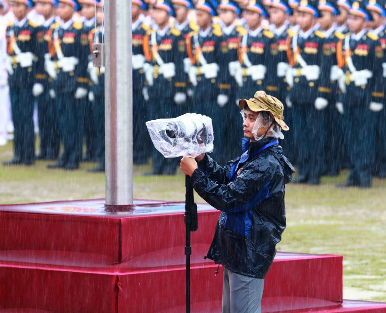 Nước mưa cứ chảy trên mặt, rồi luồn qua cổ áo mưa làm ướt cả người. Bàn tay tôi luồn lách trong túi nylon để không làm ướt máy ảnh, kịp thời bám sát các diễn biến của sự kiện. Chốc chốc lại đưa phần áo còn khô lên lau ống kính, tôi cố gắng bao quát các vị trí trên khán đài để không bỏ sót bất cứ khoảnh khắc nào. Đó thực sự là những trải nghiệm tác nghiệp đáng nhớ mà tôi chưa từng trải qua. Ở một vị trí khác nơi khán đài B, anh Tuấn Anh với chiếc ống kính khổng lồ cũng vất vả nép vào dưới chiếc ô của đồng nghiệp, kiên trì bám trụ vị trí đã được phân công. Phóng viên chuyên trách Dương Giang chạy vào sân dưới mưa tầm tã, cũng lập tức vào vị trí, vừa chụp những hình ảnh của Lãnh đạo Đảng, Nhà nước vừa ghi lại đầy đủ và đa dạng hình ảnh diễu binh, diễu hành.
