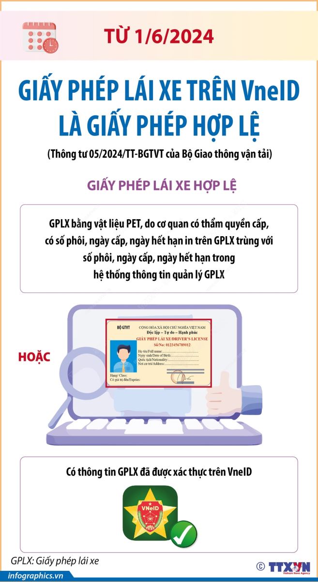 Phổ biến giáo dục Pháp luậtThông tin đồ họa Từ 1/6/2024: Giấy phép lái xe trên VNeID là giấy phép hợp lệ Thứ tư, 05/06/2024 10:51 Theo khoản 24 Điều 4 Thông tư 05/2024/TT-BGTVT ngày 31/3/2024 của Bộ Giao thông vận tải sửa đổi, bổ sung một số điều của các Thông tư liên quan đến lĩnh vực vận tải đường bộ, dịch vụ hỗ trợ vận tải đường bộ, phương tiện và người lái, từ 1/6/2024, ngoài GPLX bằng vật liệu PET. do cơ quan có thẩm quyền cấp, có số phôi, ngày cấp, ngày hết hạn in trên giấy phép lái xe trùng với số phôi, ngày cấp, ngày hết hạn trong hệ thống thông tin quản lý GPLX thì thông tin giấy phép lái xe đã được xác thực trên VneID cũng được coi là giấy phép lái xe hợp lệ.