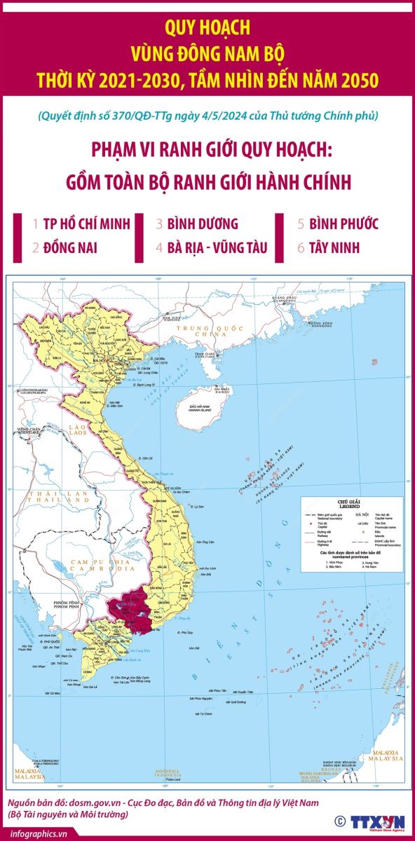 Phổ biến giáo dục Pháp luậtThông tin đồ họa Quy hoạch vùng Đông Nam Bộ thời kỳ 2021-2030, tầm nhìn đến năm 2050: Phạm vi ranh giới quy hoạch Thứ tư, 05/06/2024 11:00 Quyết định số 370/QĐ-TTg ngày 4/5/2024 của Thủ tướng Chính phủ đặt mục tiêu xây dựng Đông Nam Bộ trở thành vùng văn minh, hiện đại, phát triển năng động; là trung tâm hàng đầu của cả nước và khu vực Đông Nam Á về kinh tế, tài chính, giáo dục, đào tạo, khoa học, công nghệ, đổi mới sáng tạo, chuyển đổi số; giữ vai trò quan trọng trong liên kết và thúc đẩy phát triển các vùng khác. Phát triển vùng Đông Nam Bộ bảo đảm phù hợp với Chiến lược phát triển kinh tế - xã hội cả nước, chiến lược, quy hoạch cấp quốc gia; đi đầu trong thực hiện các mục tiêu phát triển của đất nước và hội nhập quốc tế. Tầm nhìn đến năm 2050, Đông Nam Bộ trở thành vùng phát triển, có thu nhập cao; tốc độ tăng trưởng tổng sản phẩm trên địa bàn (GRDP) giai đoạn 2031-2050 đạt khoảng 7,5%/năm, GRDP/người đến năm 2050 đạt khoảng 54.000 USD…