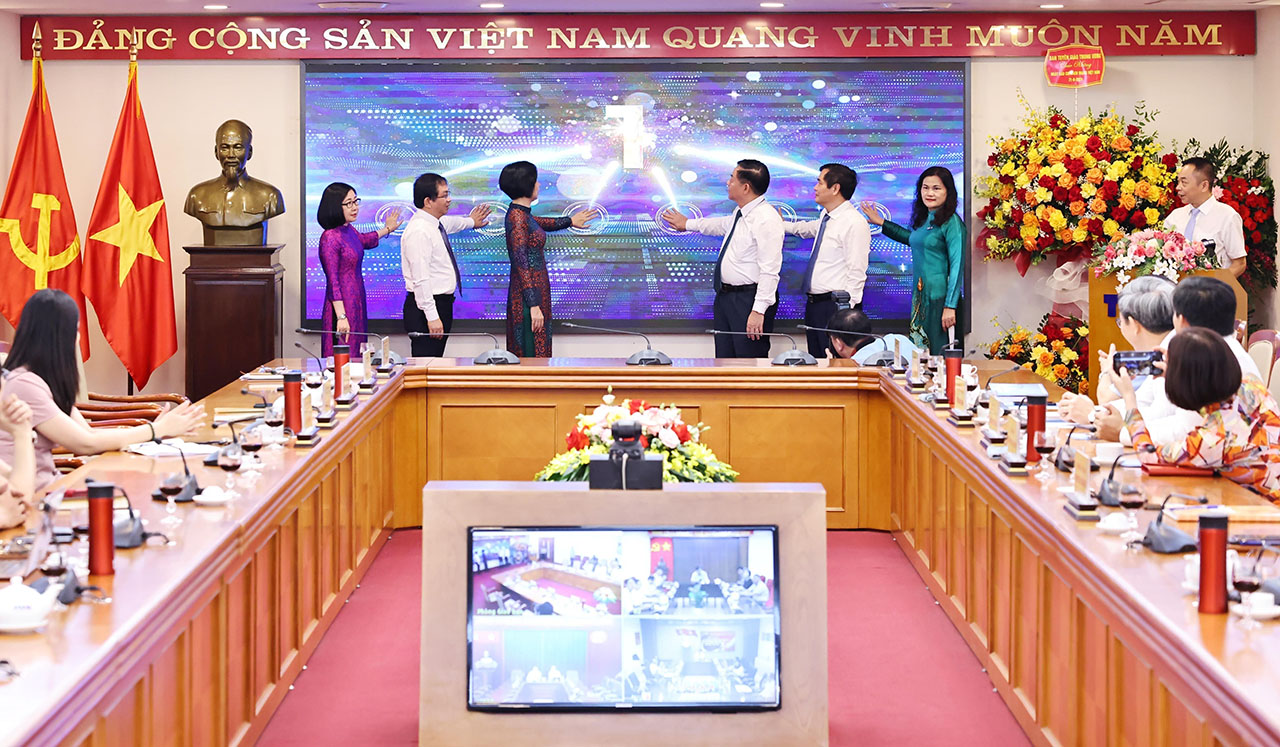 | Trưởng ban Tuyên giáo Trung ương Nguyễn Trọng Nghĩa, Tổng giám đốc TTXVN Vũ Việt Trang cùng các đại biểu tại Trung tâm Thông tấn quốc gia, ngày 17/6 |