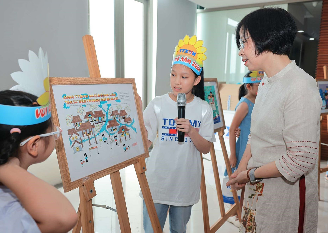 Tổng giám đốc TTXVN Vũ Việt Trang lắng nghe các cháu thuyết trình về bức tranh của mình tại trưng bày tranh với chủ đề “Con yêu gia đình và ngôi nhà Thông tấn”, ngày 18/6