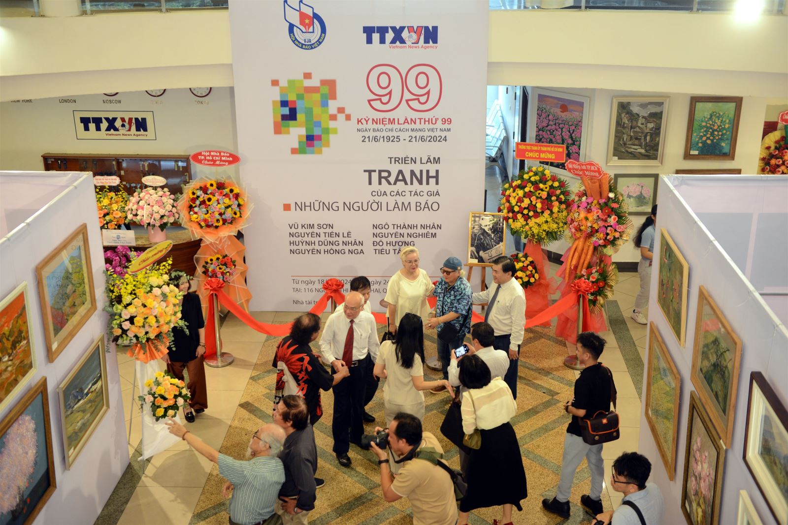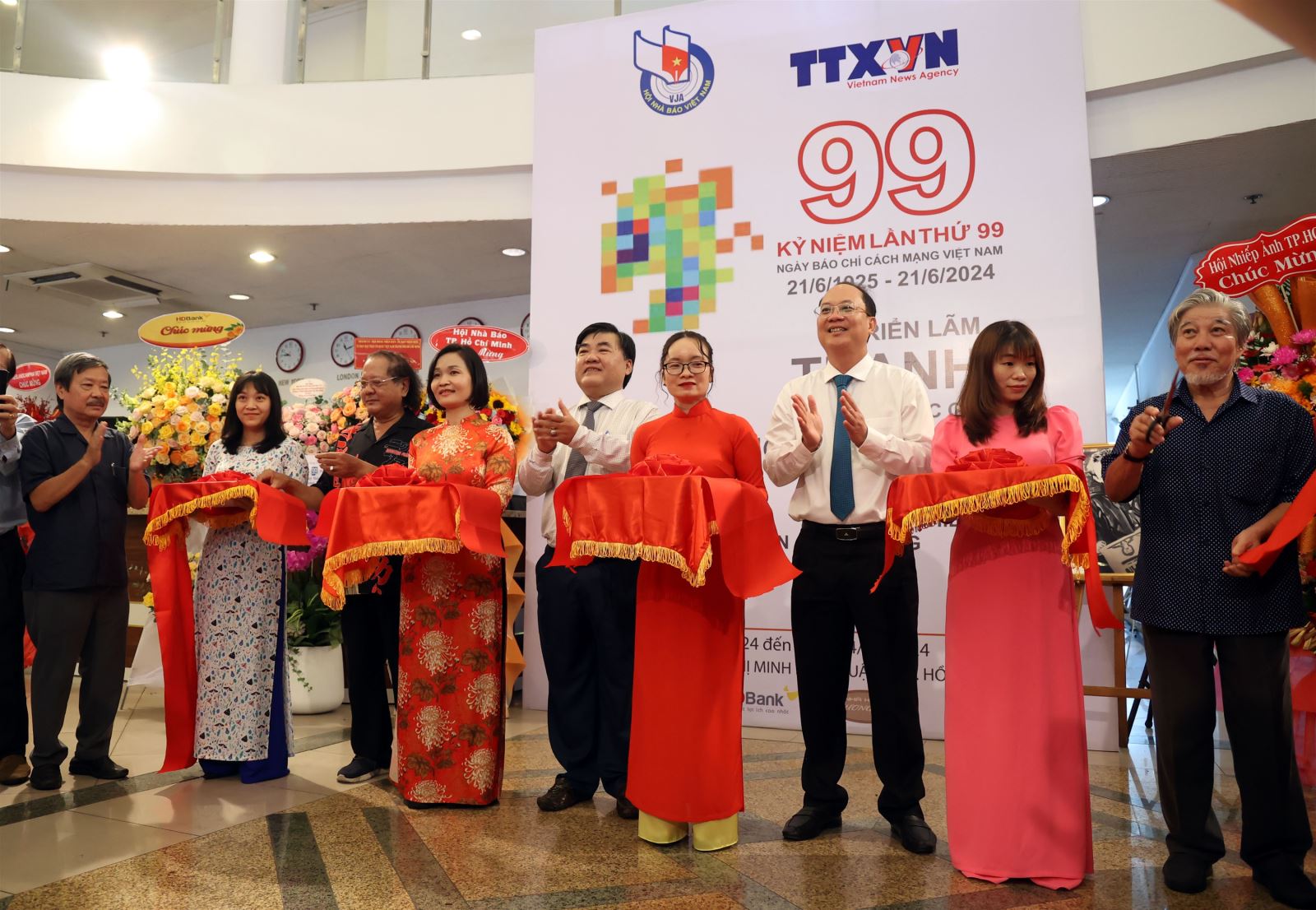 | Các đại biểu cắt băng khai mạc triển lãm tranh “99” tại trụ sở Cơ quan TTXVN khu vực phía Nam, ngày 18/6 |