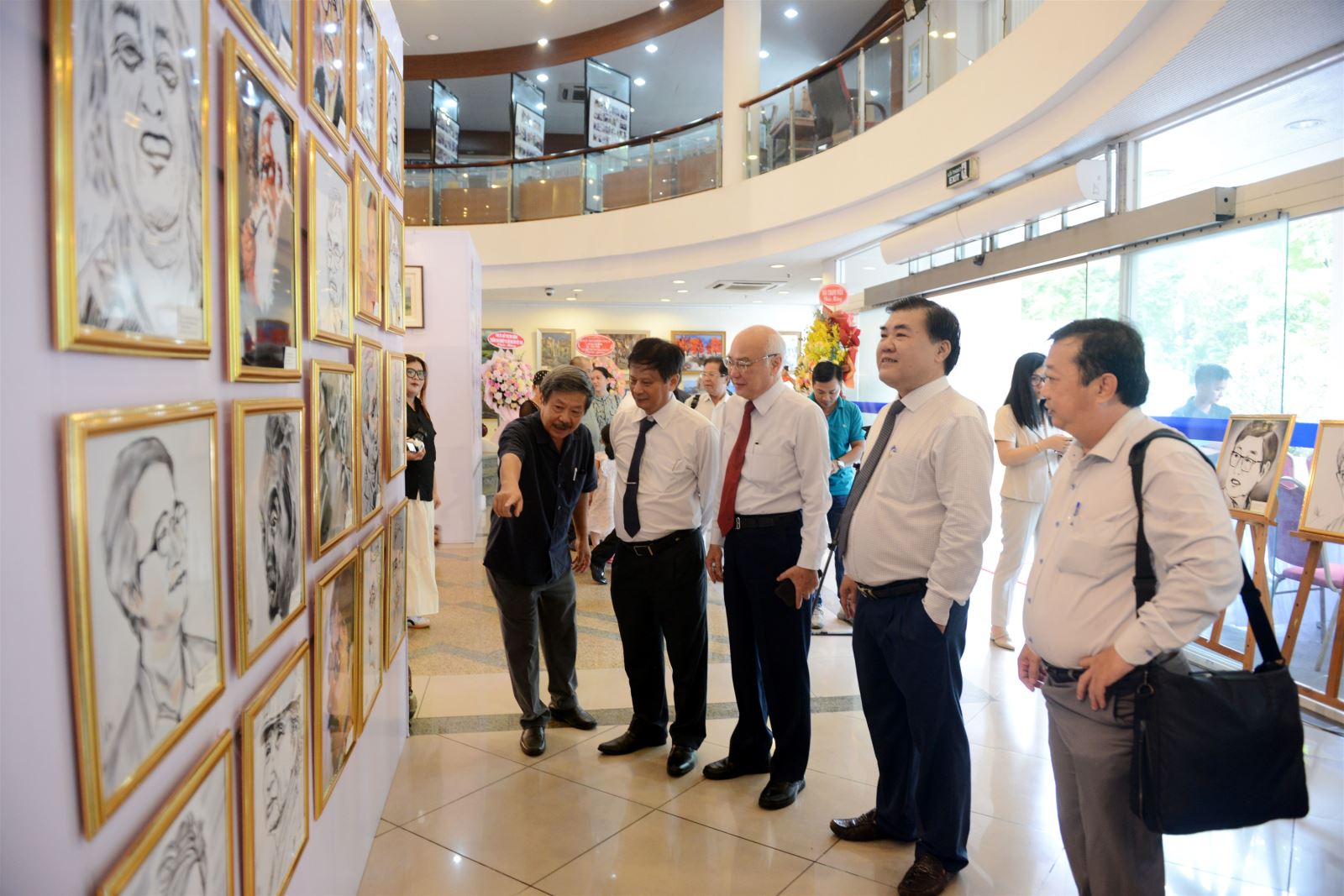 | Nhà báo Nguyễn Tiến Lễ, Trưởng nhóm 99, giới thiệu các tác phẩm với các đại biểu tham quan triển lãm tranh “99” tại trụ sở Cơ quan TTXVN khu vực phía Nam, ngày 18/6 |
