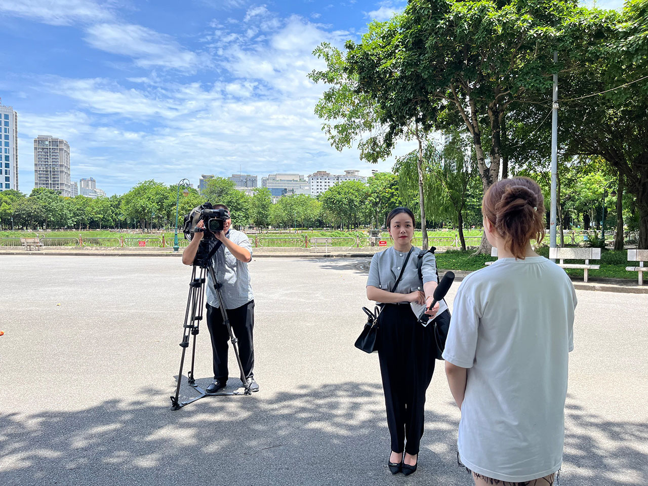 | Phóng viên Trung tâm Truyền hình Thông tấn Vũ Hồng Vân trong một chuyến tác nghiệp, tháng 6/2024 |