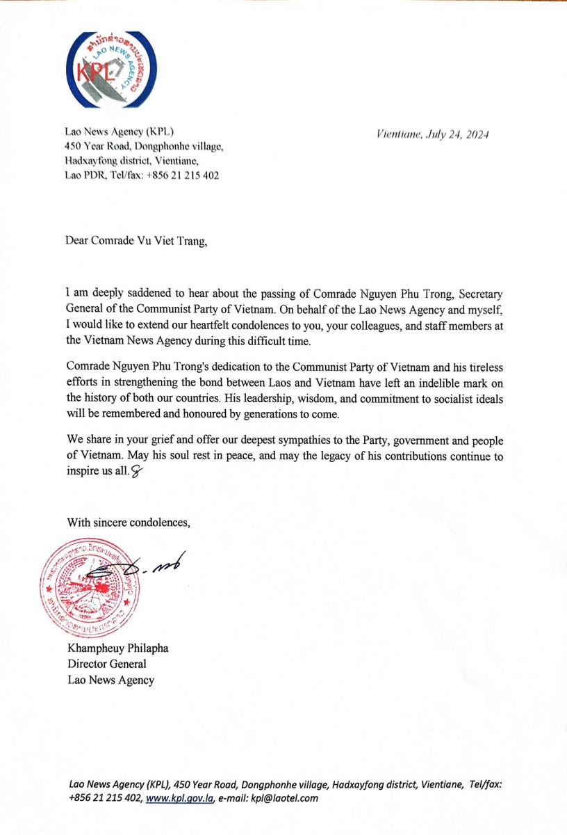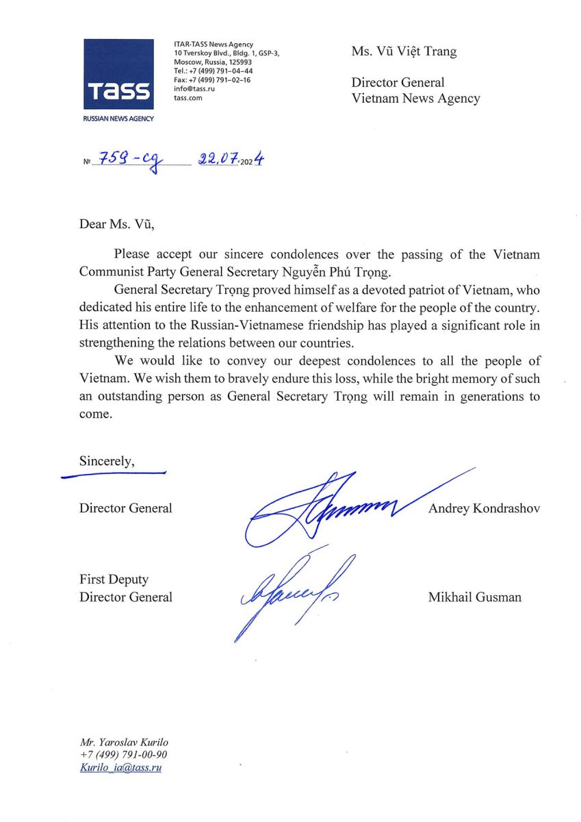 Sự kiện và kỷ niệmTin trong ngành Các hãng thông tấn gửi điện, thư chia buồn Tổng Bí thư Nguyễn Phú Trọng từ trần Thứ năm, 25/07/2024 16:44 Được tin Tổng Bí thư Ban Chấp hành Trung ương Đảng Cộng sản Việt Nam Nguyễn Phú Trọng từ trần, lãnh đạo các hãng thông tấn TASS (Nga) và KPL (Lào) đã gửi điện, thư chia buồn. * Ngày 22/7, Tổng giám đốc hãng thông tấn TASS (Nga) Andrey Kondrashov và Phó tổng giám đốc thứ nhất Mikhail Gusman đã gửi điện chia buồn tới Tổng giám đốc Thông tấn xã Việt Nam (TTXVN) Vũ Việt Trang. Nội dung bức điện như sau: “Chúng tôi xin gửi lời chia buồn chân thành nhất trước sự ra đi của Tổng Bí thư Ban Chấp hành Trung ương Đảng Cộng sản Việt Nam Nguyễn Phú Trọng. Tổng Bí thư Nguyễn Phú Trọng là nhà lãnh đạo tận tụy vì nước vì dân, người đã cống hiến cả cuộc đời mình để đưa Việt Nam ngày càng phồn vinh và phát triển. Sự quan tâm của Tổng Bí thư với mối quan hệ hữu nghị Nga - Việt đóng vai trò quan trọng trong việc củng cố mối quan hệ giữa hai đất nước. Chúng tôi xin gửi lời chia buồn sâu sắc nhất tới toàn thể nhân dân Việt Nam. Chúng tôi mong người dân sẽ vượt qua được sự mất mát to lớn này và tin rằng những ký ức tươi sáng về một con người xuất chúng như Tổng Bí thư Nguyễn Phú Trọng sẽ còn được lưu truyền mãi cho các thế hệ mai sau”. * Ngày 24/7, Tổng giám đốc Thông tấn xã KPL (Lào) Khampheuy Philapha đã gửi điện chia buồn tới Tổng giám đốc TTXVN Vũ Việt Trang. Nội dung bức điện như sau: “Tôi vô cùng đau buồn khi nghe tin đồng chí Nguyễn Phú Trọng, Tổng Bí thư Ban Chấp hành Trung ương Đảng Cộng sản Việt Nam từ trần. Thay mặt cho Thông tấn xã Lào và cá nhân tôi, tôi xin gửi lời chia buồn sâu sắc nhất tới các đồng chí, đồng nghiệp và cán bộ của TTXVN trong thời điểm khó khăn này. Sự cống hiến của đồng chí Nguyễn Phú Trọng cho Đảng Cộng sản Việt Nam và những nỗ lực không mệt mỏi của đồng chí trong việc củng cố mối quan hệ giữa Lào và Việt Nam đã để lại dấu ấn không thể phai mờ trong lịch sử của cả hai nước chúng ta. Sự lãnh đạo, trí tuệ và cam kết của đồng chí đối với lý tưởng xã hội chủ nghĩa sẽ được thế hệ sau ghi nhớ và tôn vinh. Chúng tôi xin được gửi lời chia buồn sâu sắc nhất tới Đảng, Chính phủ và nhân dân Việt Nam. Cầu mong linh hồn đồng chí được yên nghỉ và mong di sản từ những đóng góp của đồng chí sẽ tiếp tục truyền cảm hứng cho tất cả chúng ta…”./. Nội san Thông tấn