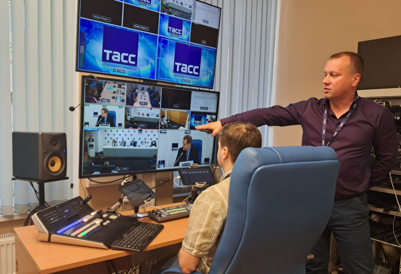 | Phòng xử lý hình ảnh và phát sóng trực tiếp nội dung cuộc họp báo diễn ra tại phòng họp báo của TASS, tháng 5/2024 |