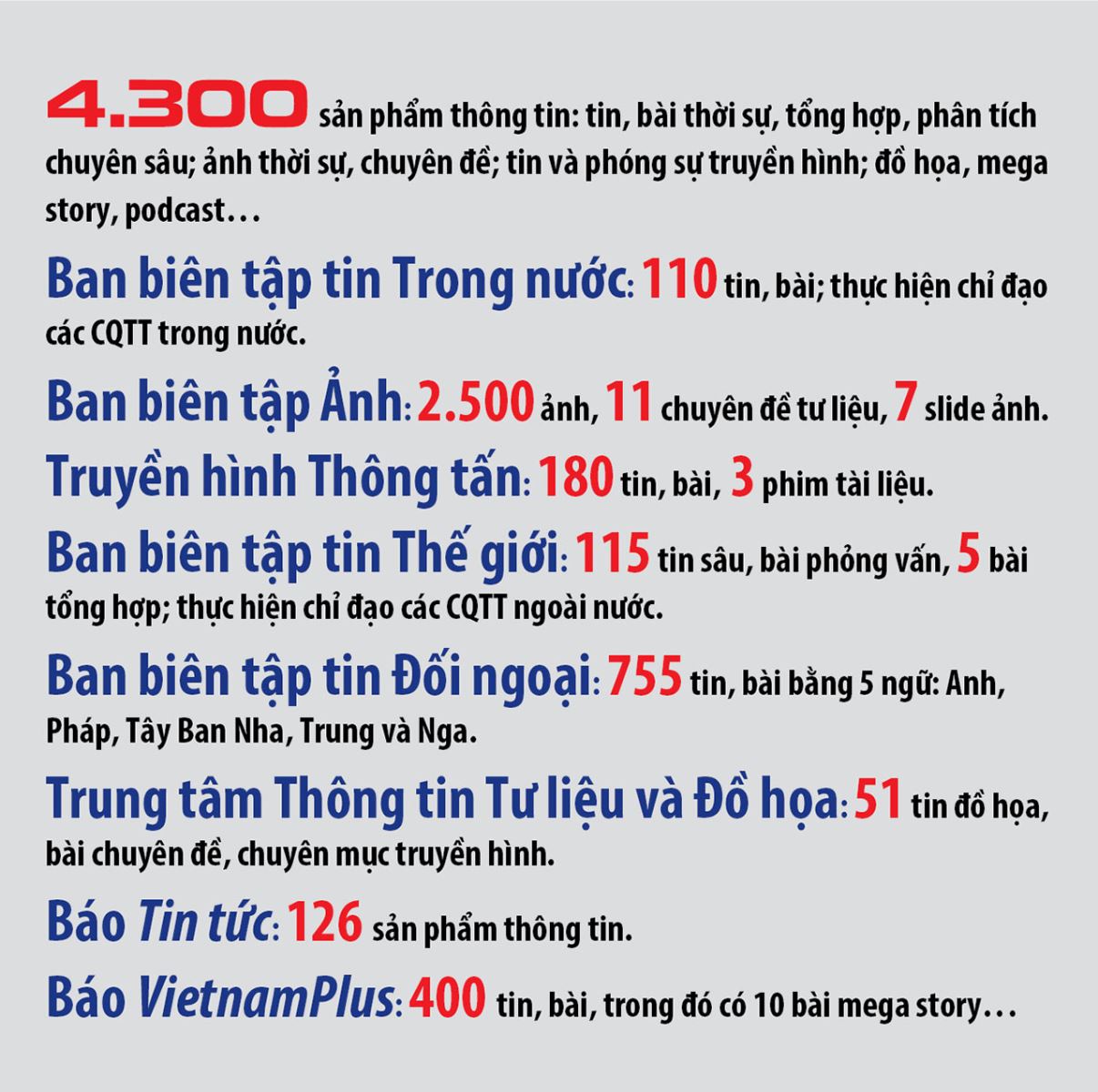 TTXVN đã huy động tổng lực các đơn vị thông tin, đơn vị giúp việc, phục vụ thông tin, các CQTT của TTXVN ở trong và ngoài nước tham gia công tác thông tin về Quốc tang bằng tất cả các loại hình báo chí với tinh thần trách nhiệm cao nhất, đảm bảo cung cấp thông tin chuẩn xác, kịp thời, trang trọng, nghiêm cẩn, tuân thủ chỉ đạo và định hướng thông tin của Ban Tuyên giáo Trung ương.