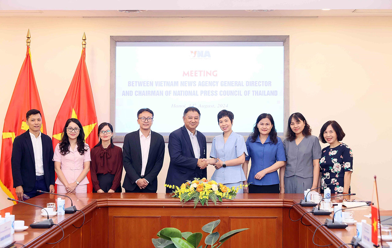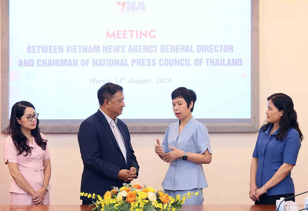 | Tổng giám đốc TTXVN Vũ Việt Trang, Chủ tịch Hội đồng Báo chí quốc gia Thái Lan Chavarong Limpattamapanee và các đại biểu, ngày 14/8 |